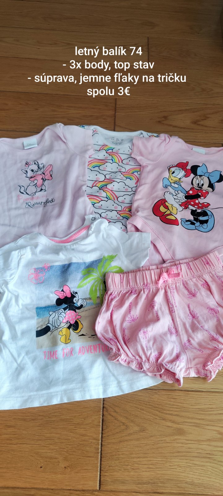 Predám balíček na leto pre dievčatko na 6-9mesiacov. Dve tričká na leto , dlžka obidvoch 31cm, šírka 27cm, k tomu dvoje nohavíc. Jedný sú rifličky sú tenšie , dlžka 38cm, a pás je na gumičku v nena...