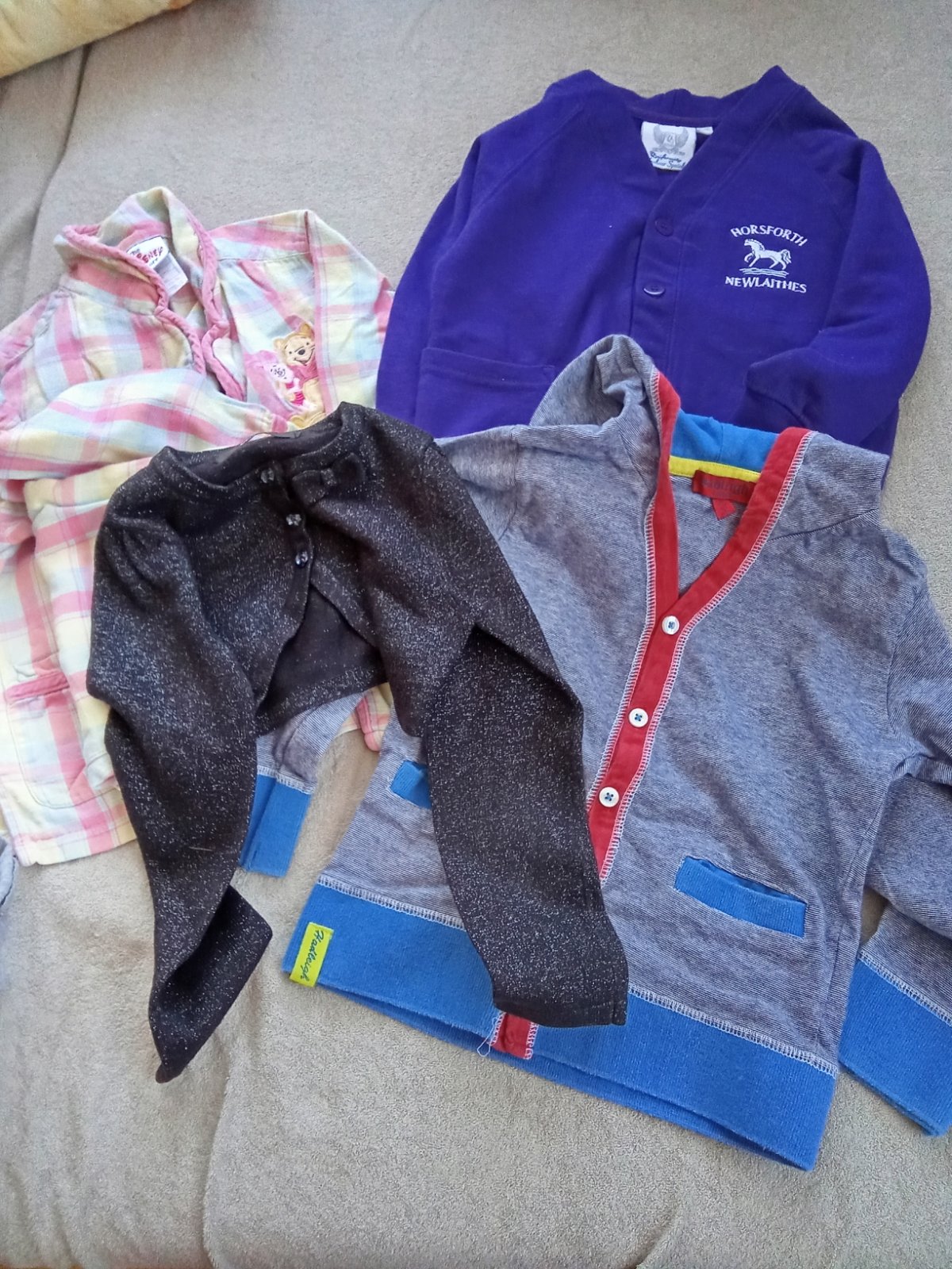 Mix veci veľ. 110 Ruzove a žlté šaty, + jeginsy nové, nenosene Modre šaty a tričko nosené, bez poskodenia (sede tričko predané) Spolu 15€