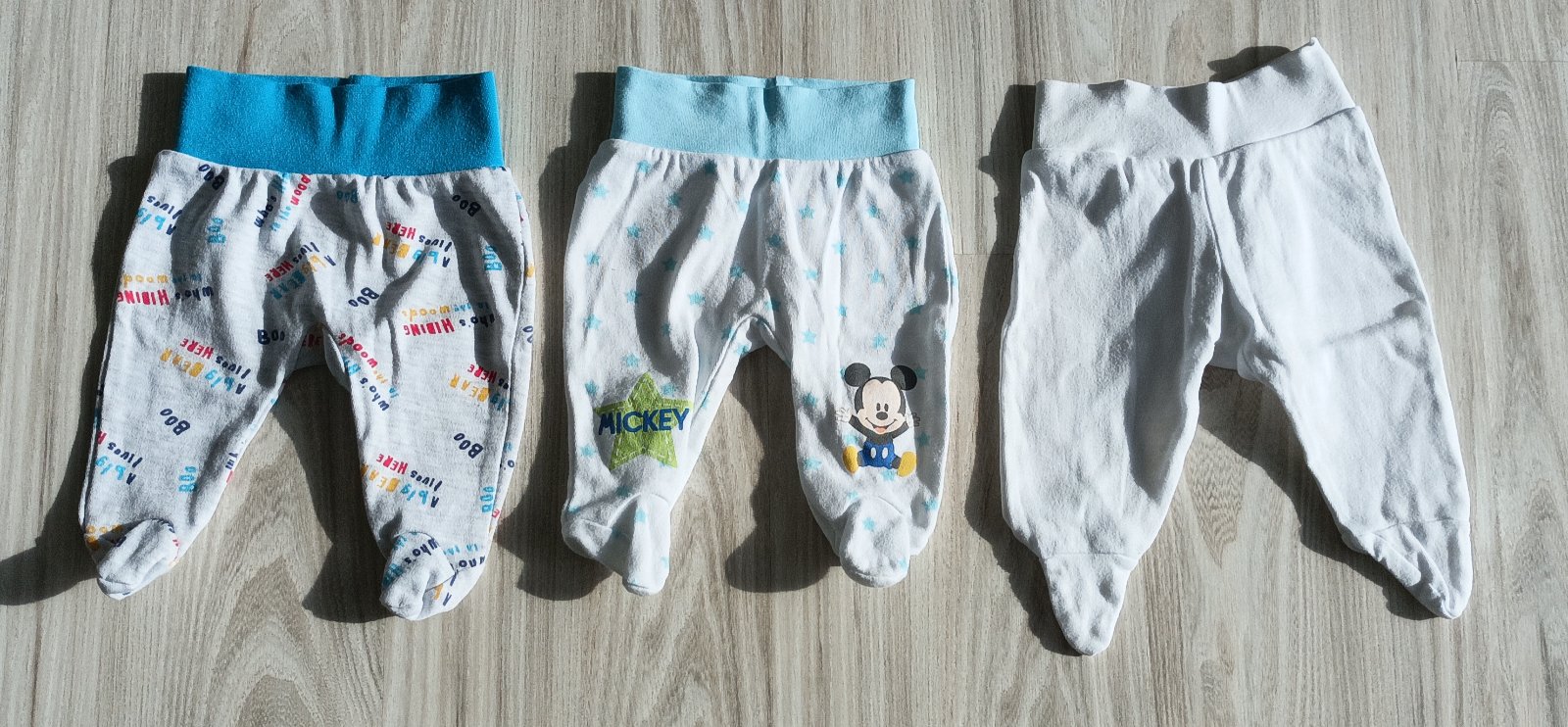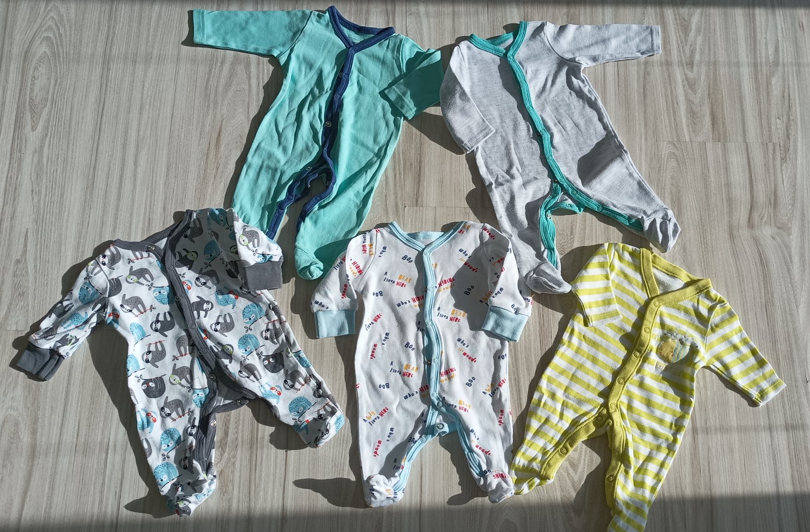 Balíček oblečenia rôznej veľkosti - polodupačky a čiapočka (veľ. 56), dupačky (62), svetrík (68) a body (80).