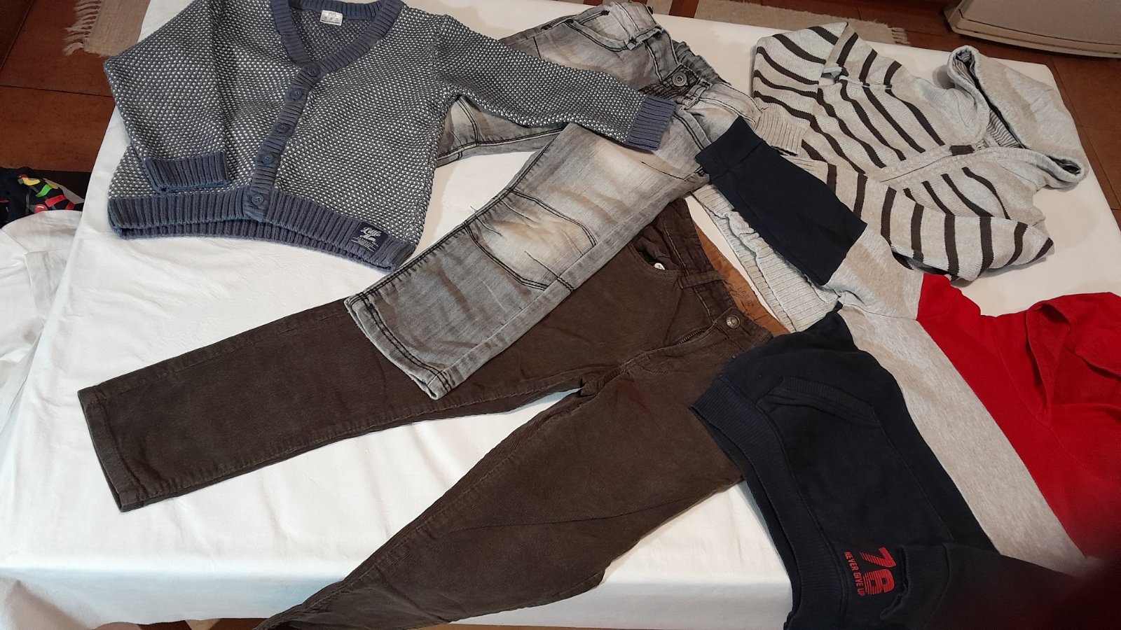 Predám balík oblečenia. Veľkosť 116. Obsahuje 4 x tepláky a 4x tričká s dlhým rukávom.