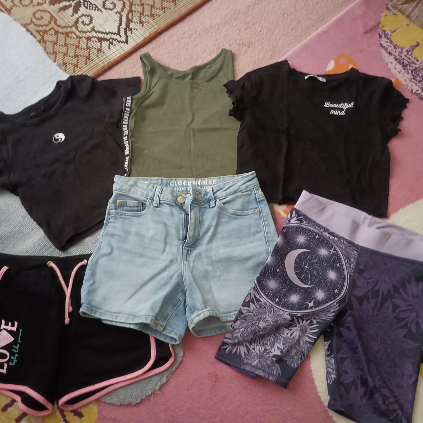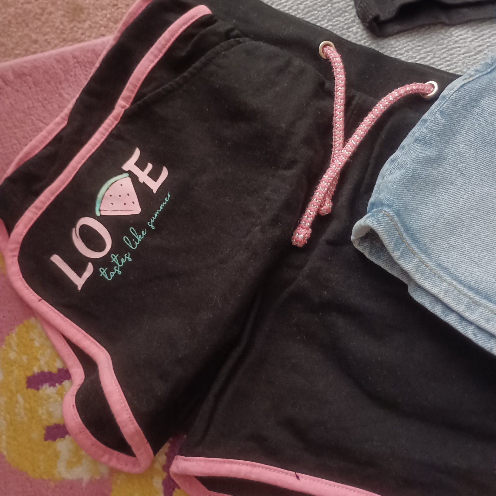 Dobrý deň predám kraťasy s veľkosťami: dlhé veľkosť-S, Krátke s čipkou XS,kratke na bokoch čipka s kvietkami-veľ.27 vsetko za 9€ bez poštovné.