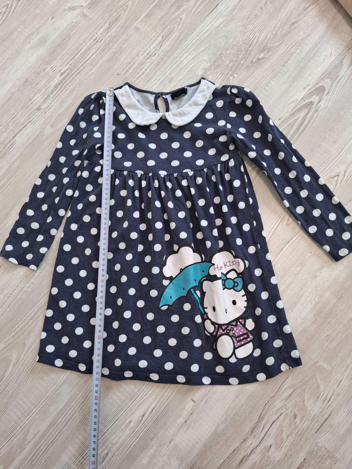 Balíček dievčenských šiat, každé sú jedinečné: saty Hello Kitty, šaty s motívom jesennych listov, HM dalmatincove šaty a šaty značky Kiki&Koko s motivom srniek.