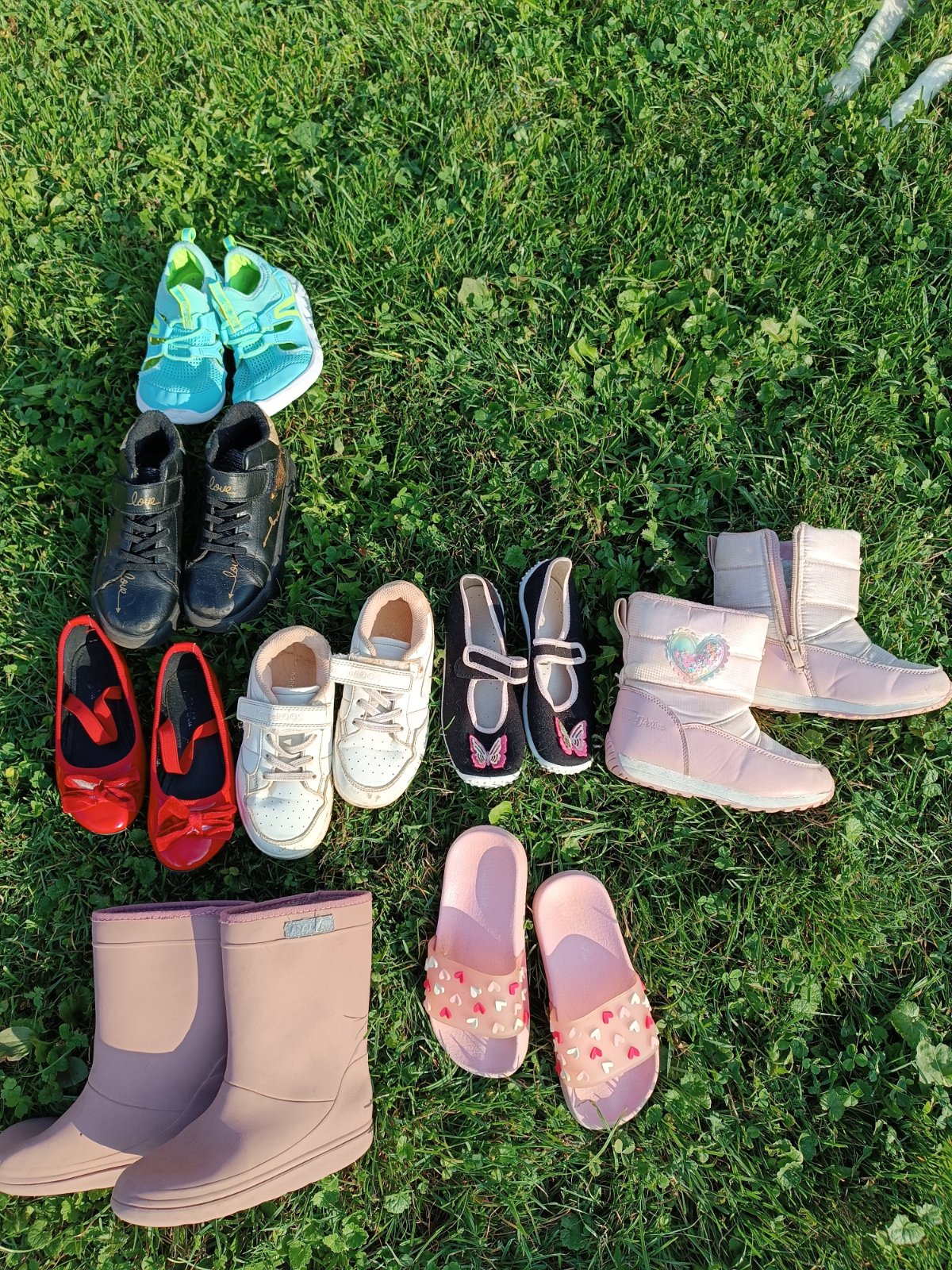 Zdravím predám po dcérke mix topánok, spodný rad teda šľapky 29, gumáky nevidno číslovanie, sú enfanty bez kožušiny, druhý rad veľ. 30, čierne 31a zelené 33. Najlepšie osobný odber Prešov Sekčov.