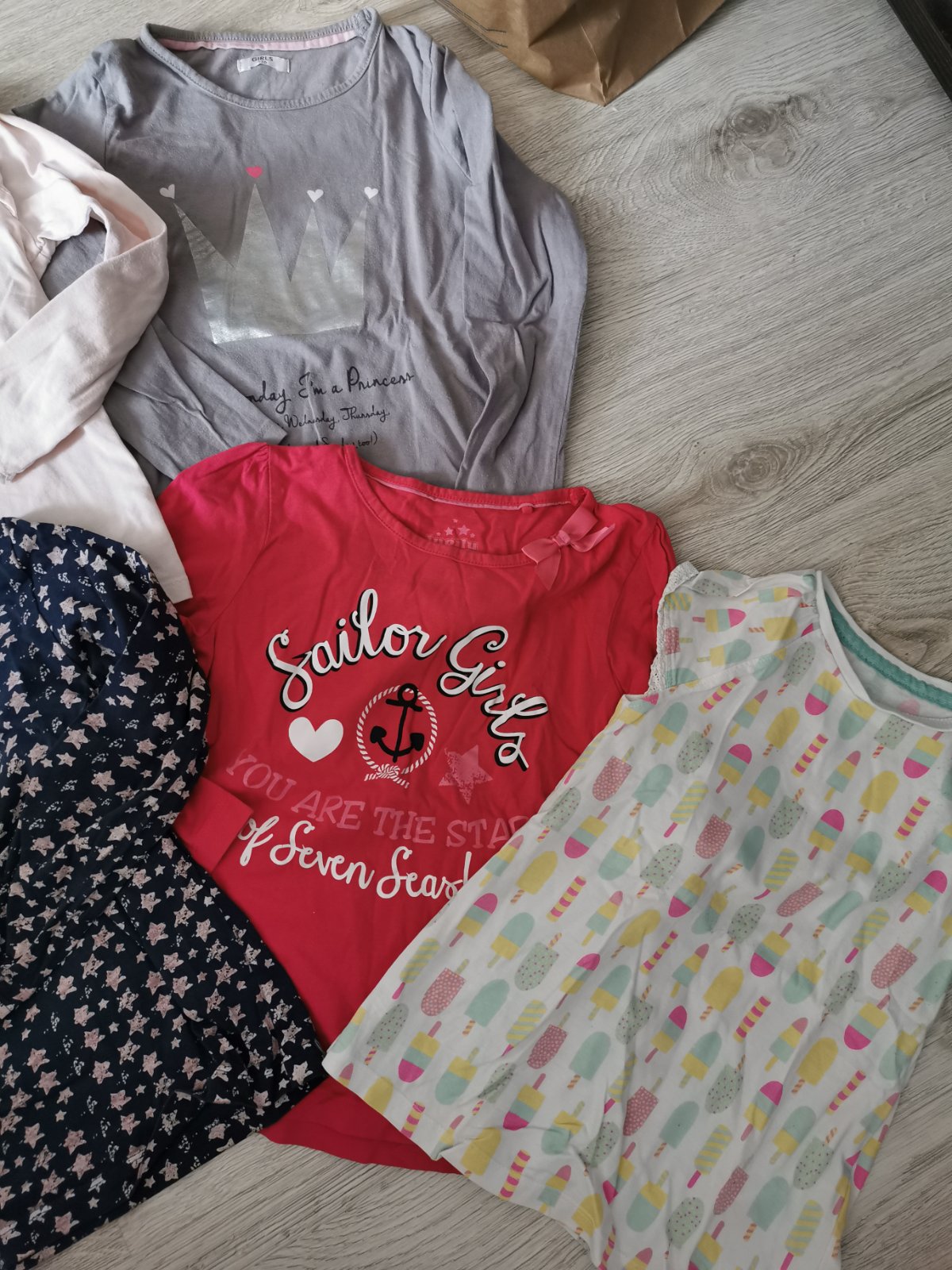 Balík obsahuje tričko ružové Frozen H&M 110/116, tričko s hviezdičkami Lupilu 110/116, ružové tričko Lupilu 110/116, sivé tričko Pepco 116 a 1x tričko kr. rukáv F&F 110.