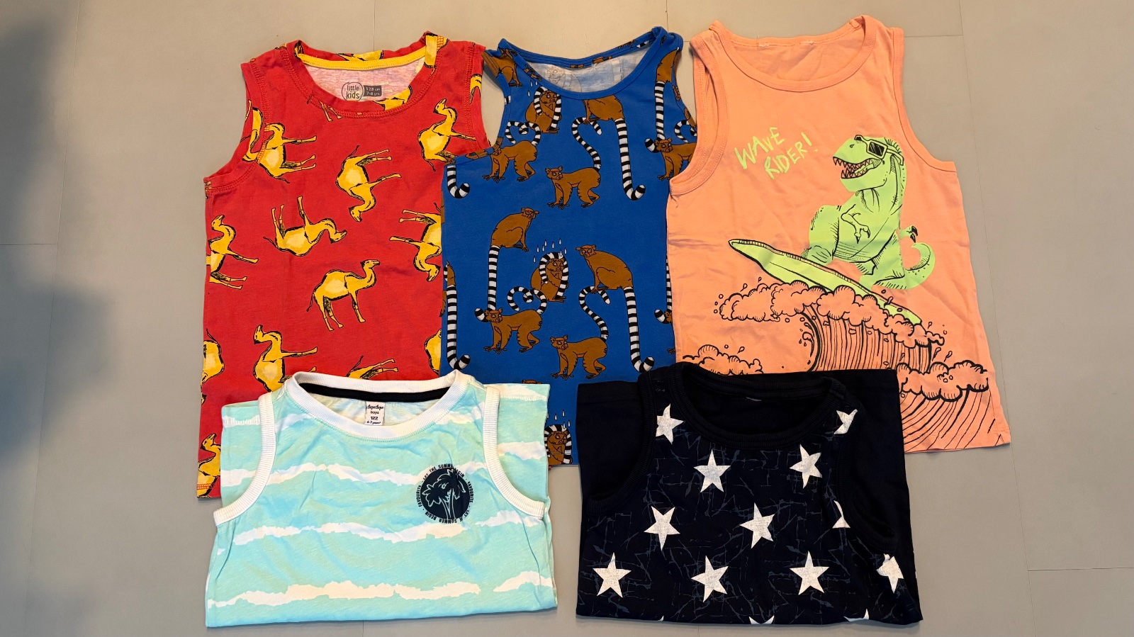 Balík letného oblečenia, veľkosť 122/128 2x kraťasy 6x tričko krátky rukáv 2x tielko ZADARMO priložím modré tričko Mimoň, vyšúchaný obrázok
