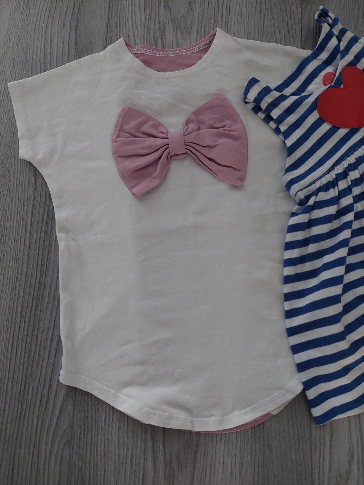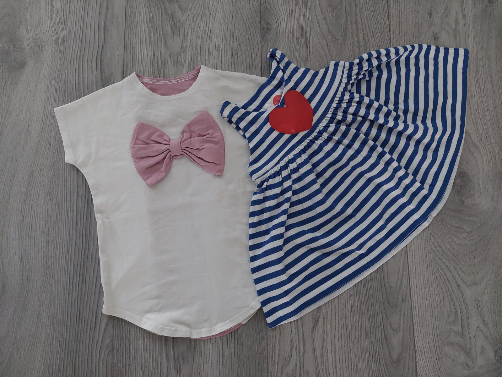 Vo veľmi peknom stave balík oblečenia na leto pre dievčatko. Šaty pásikavé pískacie s pískajúcim srdiečkom a tričko s pískajúcou mašľou. Tričko veľkosť 1-2 roky, dcéra ho nosila už najskôr väčšie ako voľné šaty a potom sa dá nosiť ako tričko. Pri nákupe 3 vecí z môjho bazáru obyčajné poštovné uhradím ja.