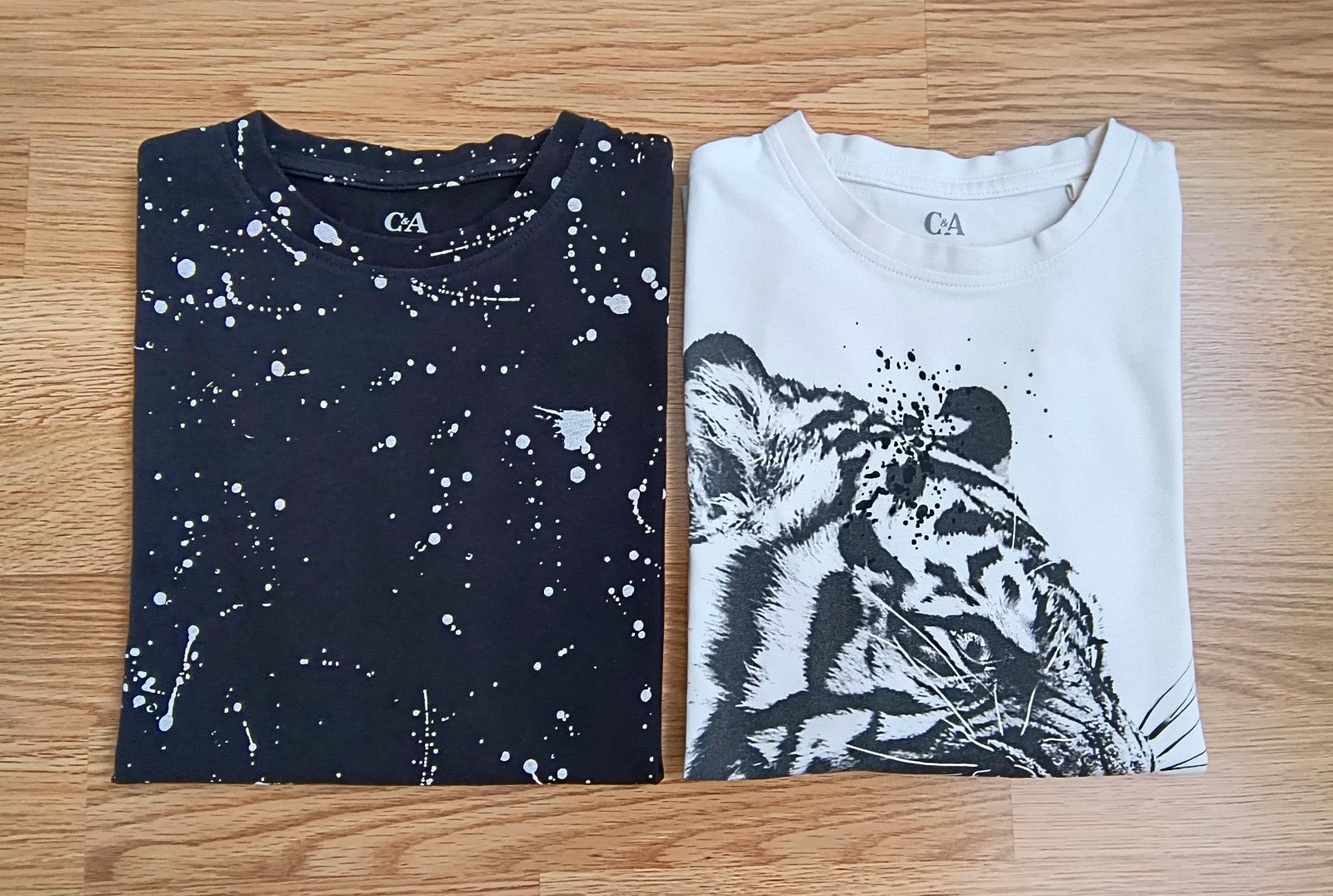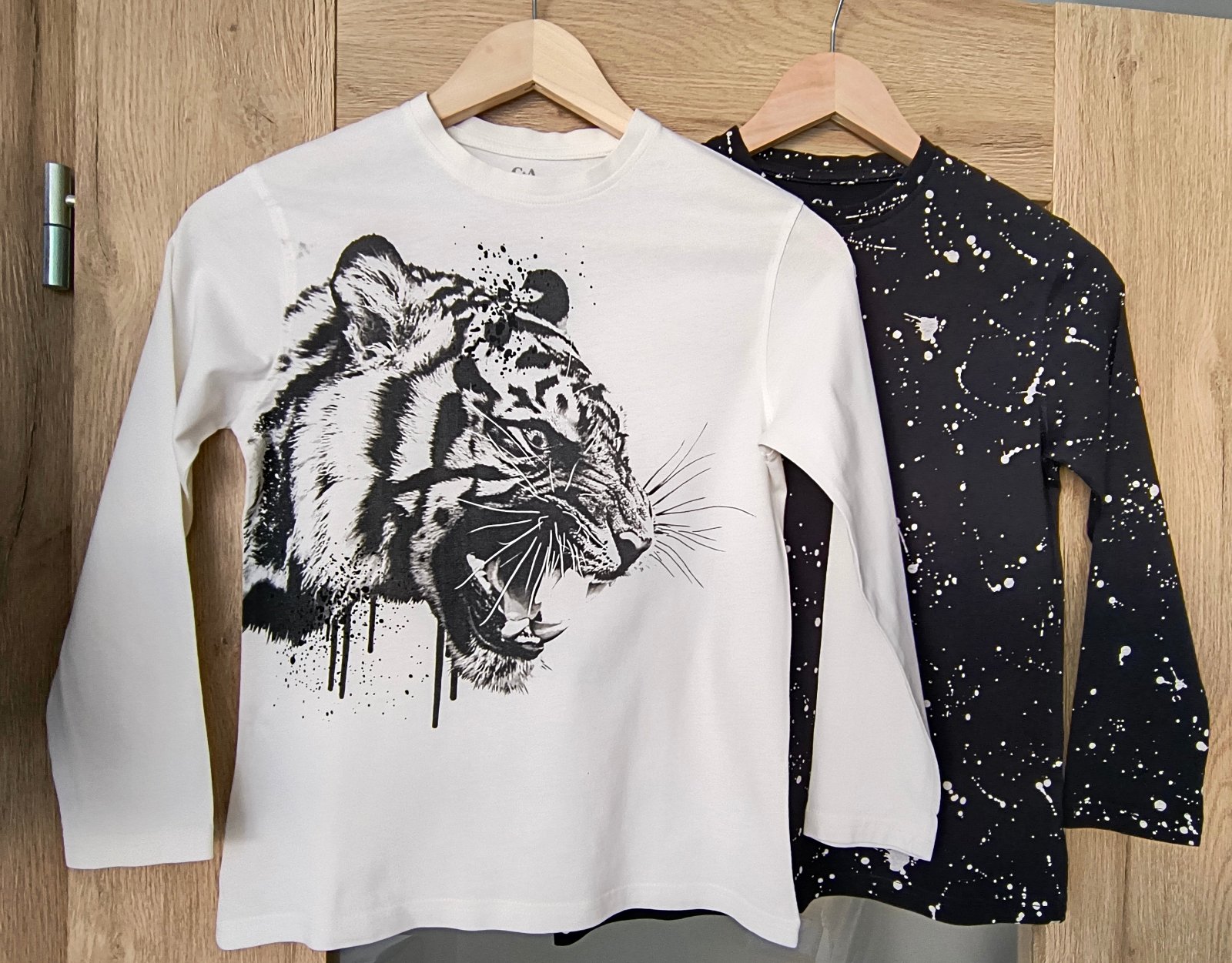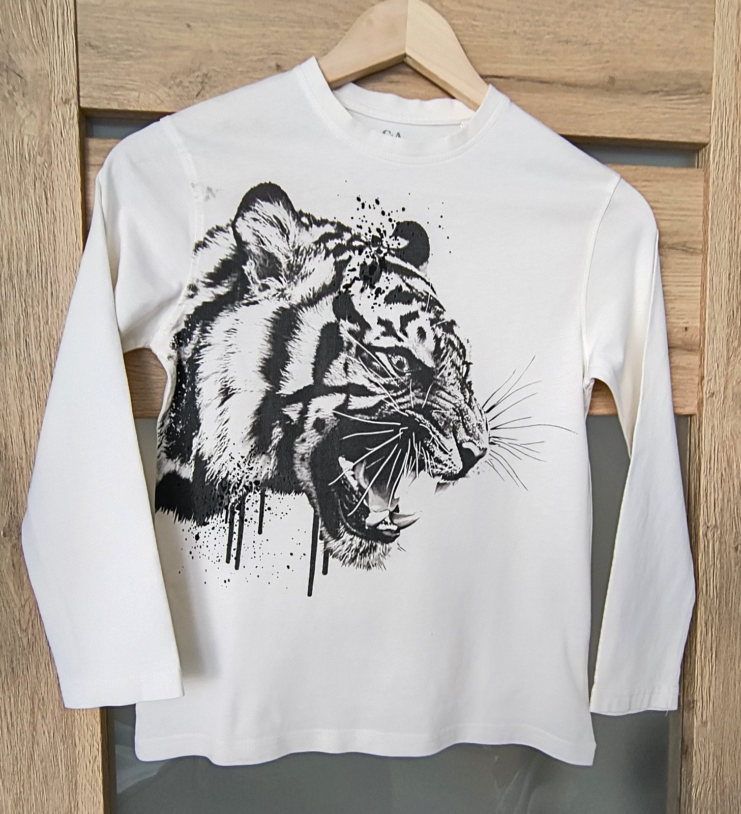 Veci už nepremeriavam sedia na veľkosť. 1x slim termo rifle s nastaviteľným pásom + 1x slim kapsáče + 2x tričko s dlhým rukávom + 1x flísová mikina + 1x sveter + 1x hrubšie tričko s dlhým rukávom. Na bielom tričku s tigrom je mini dierka, takmer nevidno.
