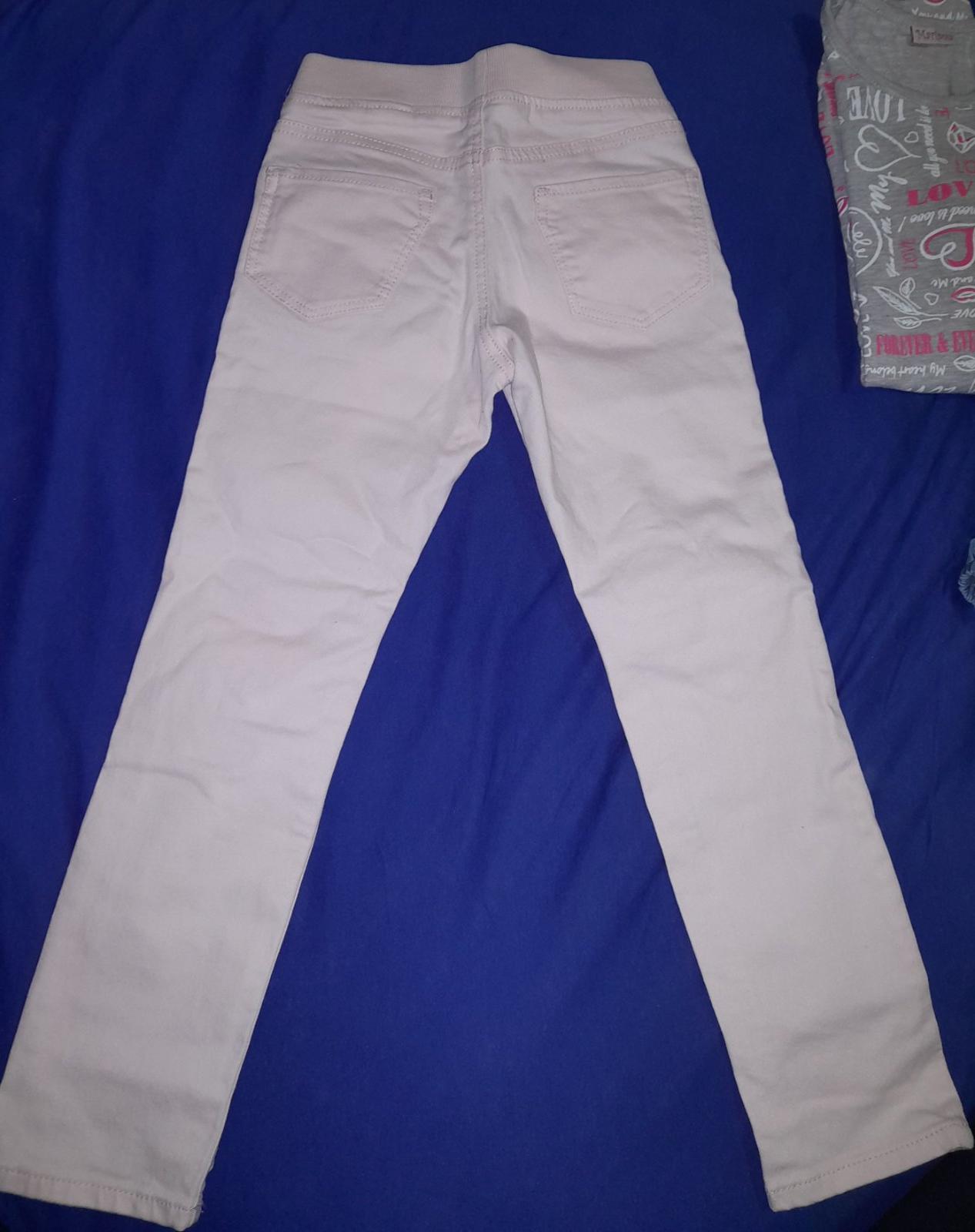 Bledoružové rifle so srdiečkami na kolenách H&M č.116 ale väčšie - minimálne nosené, 97% bavlna, 3% elastan, vnútorná dĺžka 51 cm, pás v kľude 2x27 cm