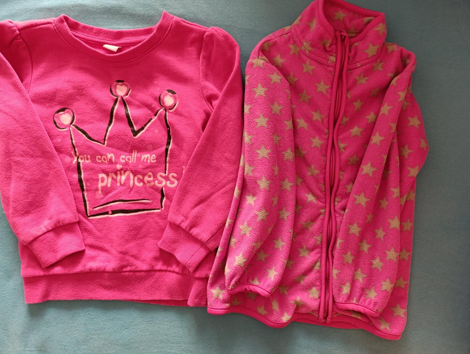 2 ks mikín vhodné na donosenie,okolo domu,na ihrisko. Ružová mikina s korunkou sa oblieka cez hlavu, Zn. Dopodopo, v. 110/116 - nemá poškodenia, ale je už dosť žmolková, spraná. Mikinka s hviezdičkami bola dcérkina obľúbená, takže je nosenie vidno, ale poškodenia nemá - žiadne dierky ani fľaky, Zn. KiK v. 110, zapínanie na zips, príjemný mäkkučký materiál, je teplučká, ale nie je veľmi hrubá, pohodlná aj pod bundu.