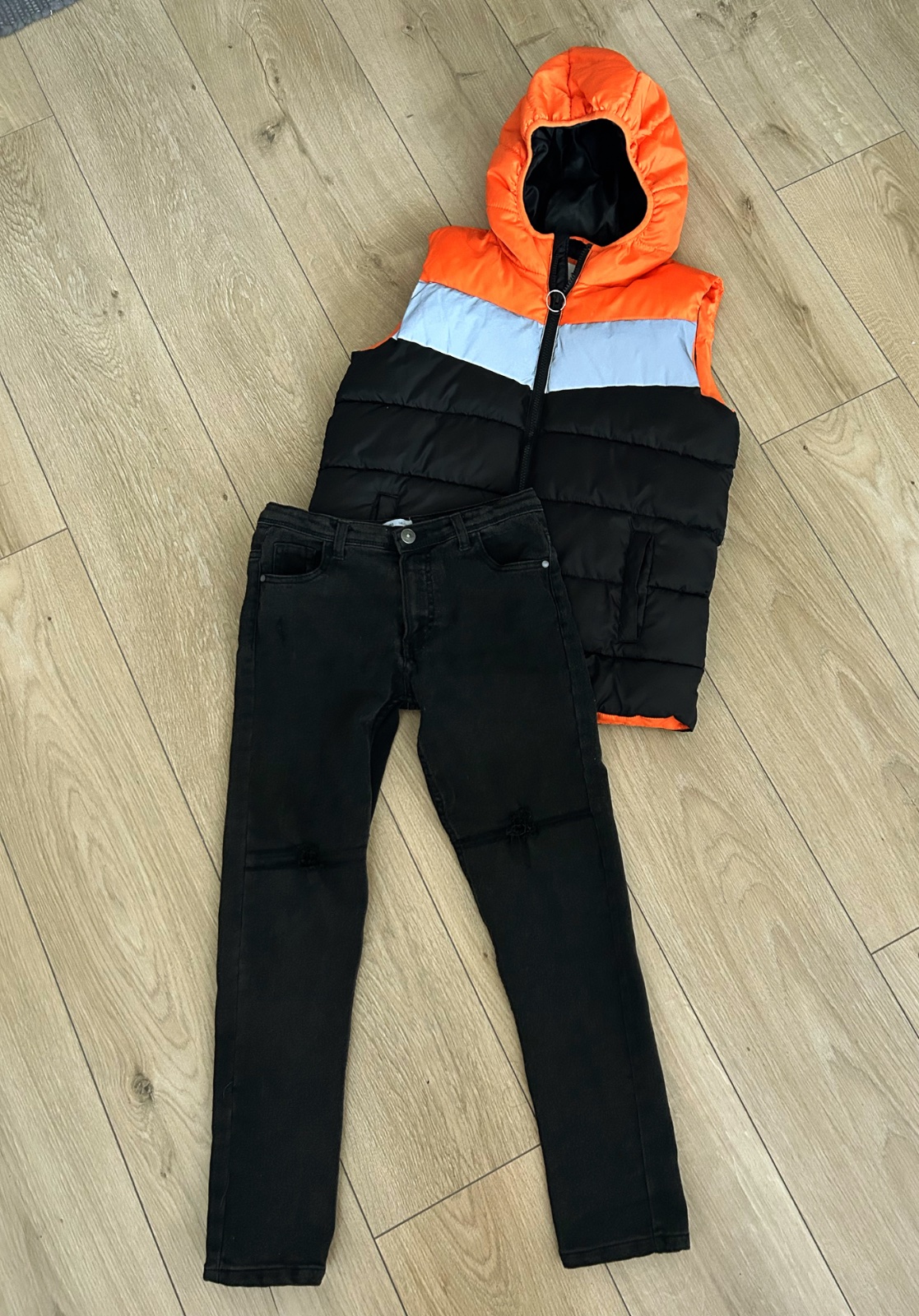 Čierne jeansy na kolenách rozparkane ,neťahá sa to ďalej ,tak sme ich kupovali . Netrhá sa to ďalej + vesta na chladnejšie počasie