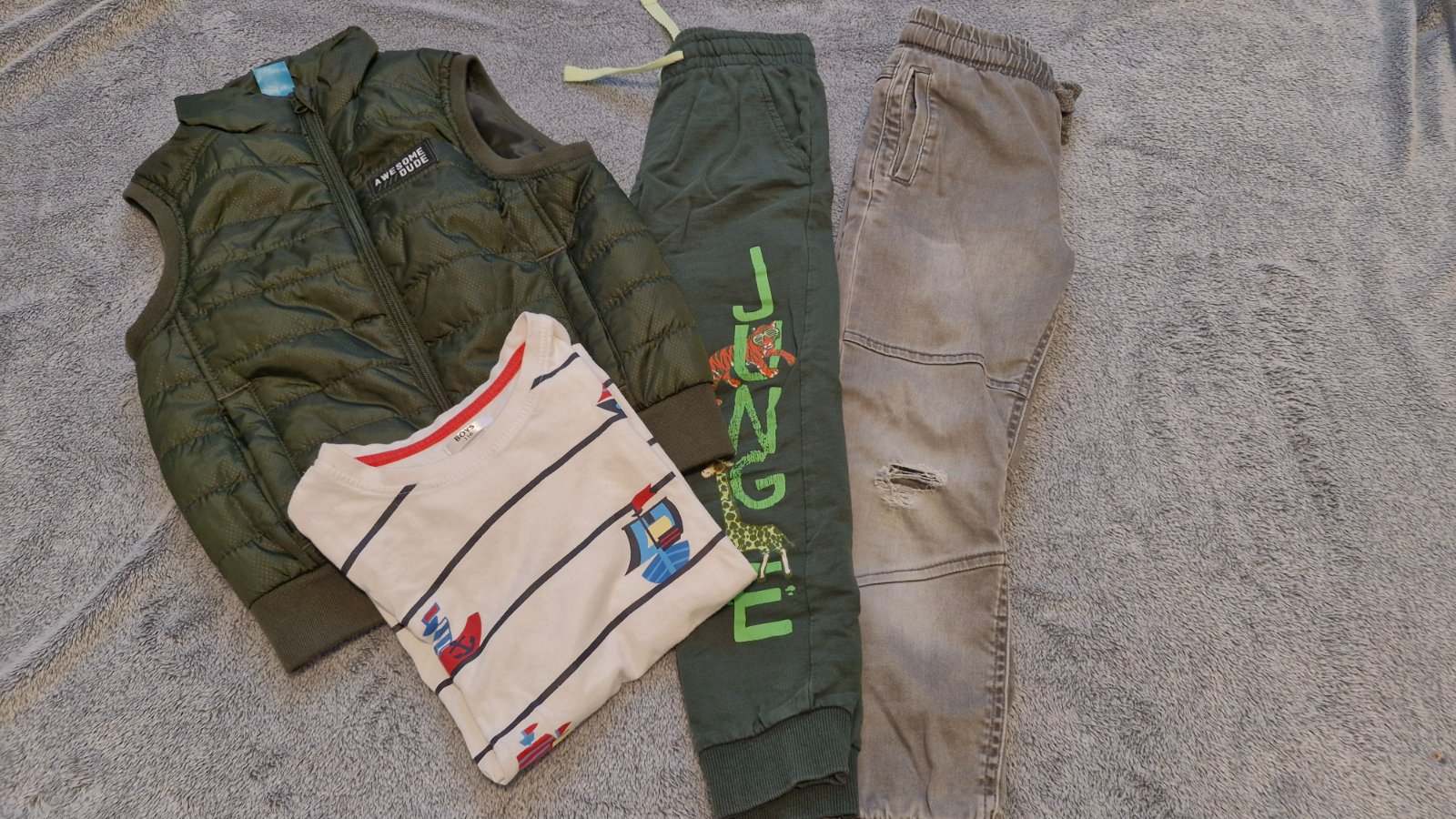 Všetko veľkosť 116, vesta, rifle (roztrhané kolená majú byť), tepláky a tričko s krátkym rukávom. Nosené bez poškodení.