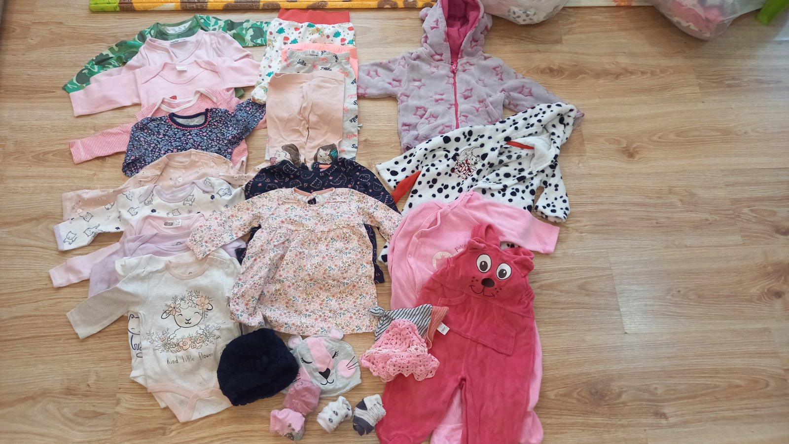 Balík oblečenia pre dievčatko vo veľkosti 80, 5x pulóver, 3x pyžamo/overal, 1x tepláková súprava, 4x bdy s dlhým rukávom, 2x body tielko, 2x nohavice