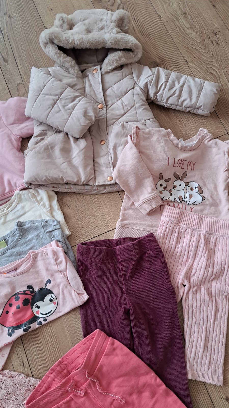 Niektoré veci oblečené raz, niektoré viackrát, všetko peknny noseny stav veci ky sú väčšinou vecie 74/80 ale sú tam aj mensie Je tam tepláková súprava, legíny, tepláky, tenisky, šaty, setik, body, ...