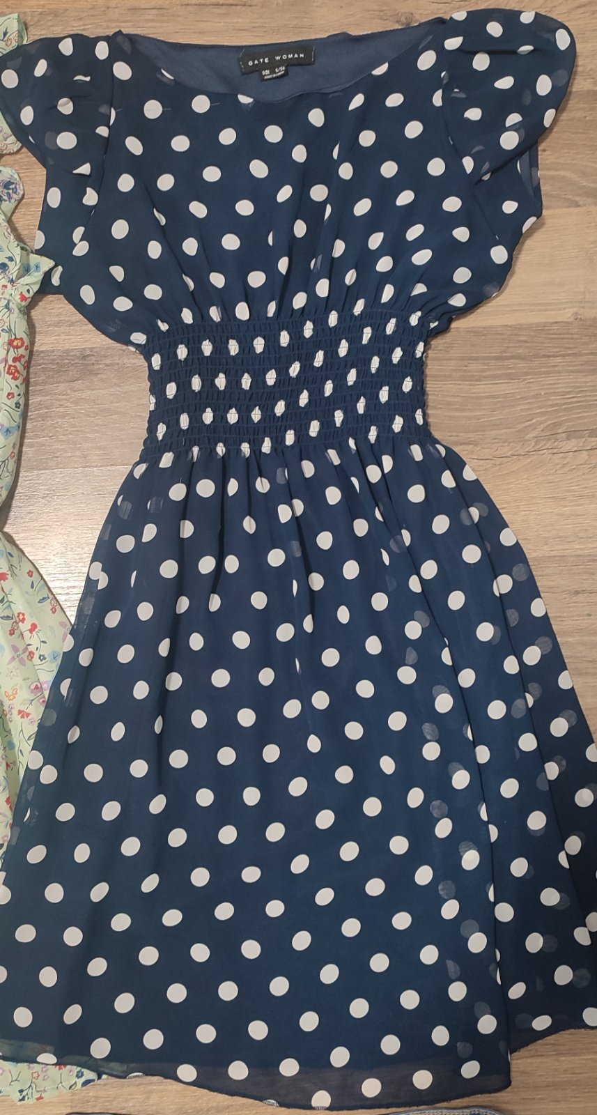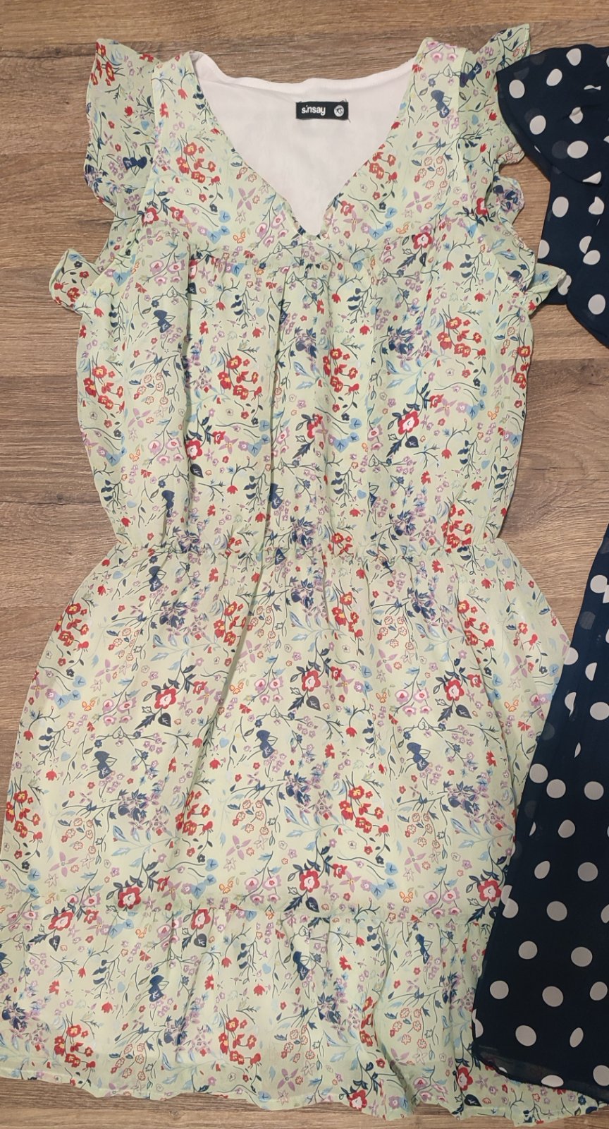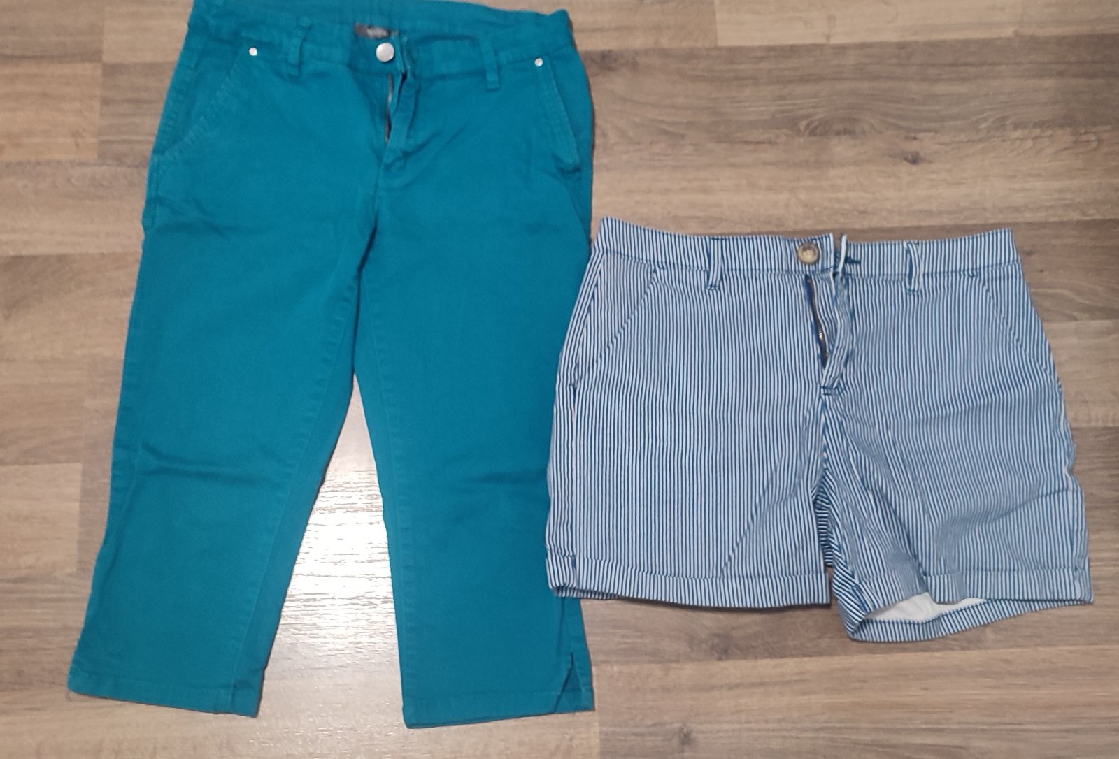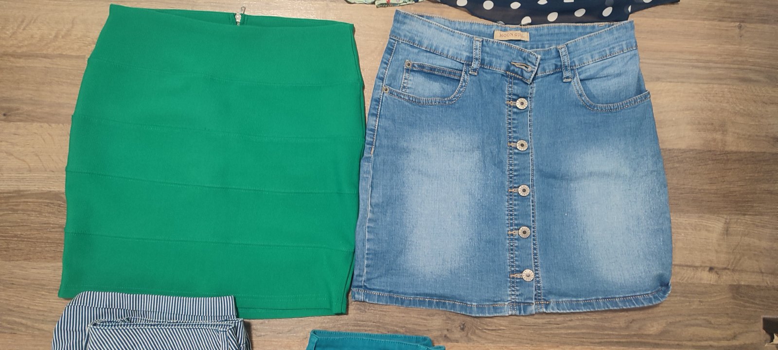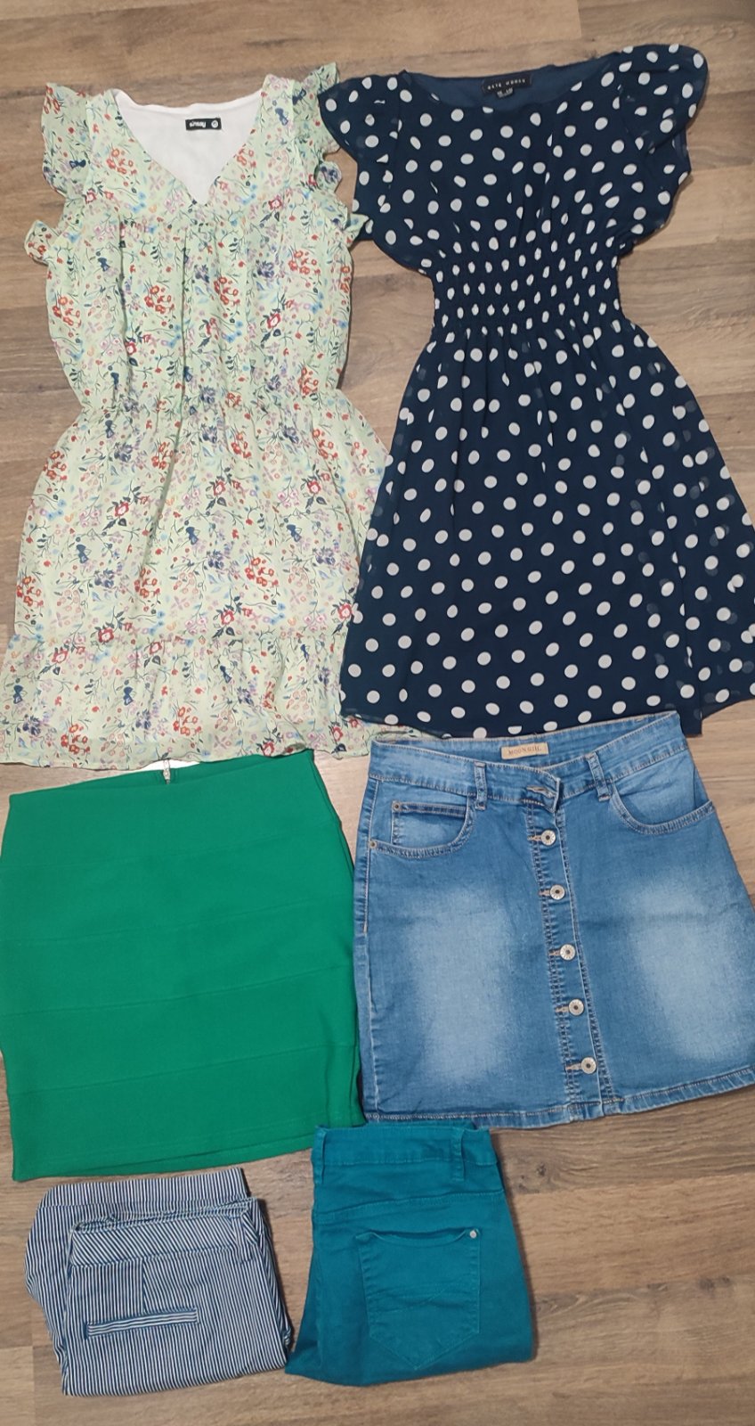 Predám balík oblečenia zobrazený na fotke v peknom stave. Zelené šaty Sinsay XS, čierne s guľkami Gate S (všimla som si jedinú chybičku v hornej časti), dve sukne a dvoje nohavíc na donosenie gratis.
