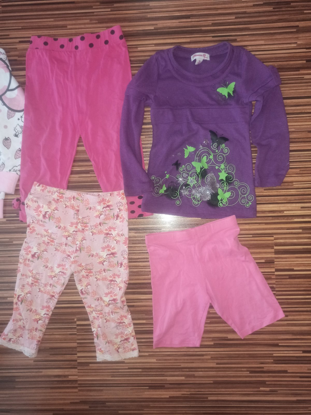 8 kusov oblecenia,saty,tricka,kratasky. Spolu 5€. K tomu pridam druhy balik gratis. Veci uz iba na doma na donosenie.