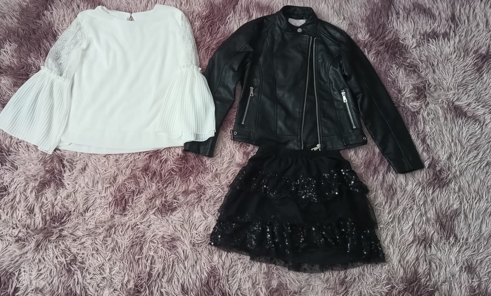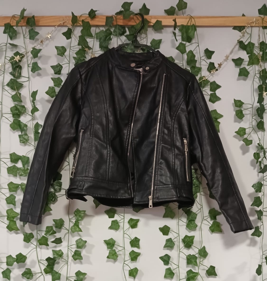 Čierna koženková bunda : Kvalitný materiál, štýlové zipsy, so vzorom srdiecka vybodkovane v koženke, top stav 134/140