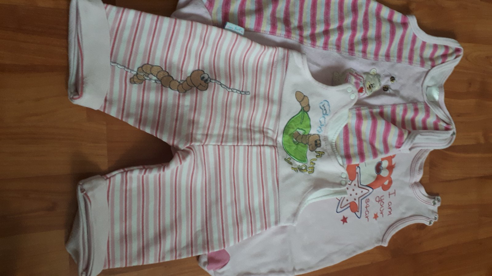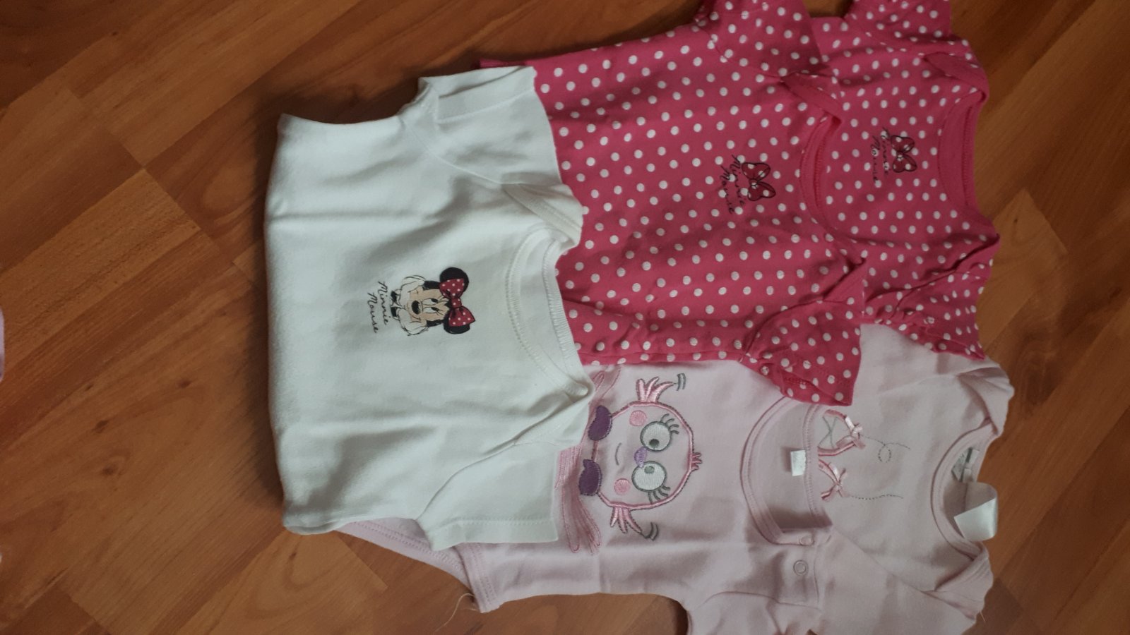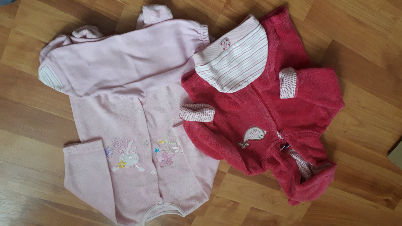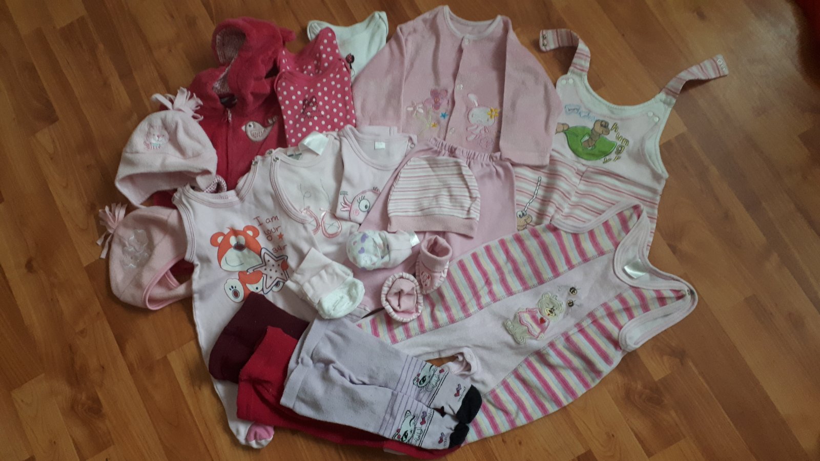 Predam veci po mojek dcérke, veci sú nosene ale ešte poslúžia. Balík obsahuje 5x body, na bielom je poznať nosenie,3x ponožky, 3x čiapka,1x mikina,1x velúrový overal sa mi zdá že bol číslo 62 Ale určite menší povedala by som ze aj 50tka, 3x dupačky, 1x polodupačky,3x pančusky majú už zmolky ale na doma poslúžia. Predam spolu.