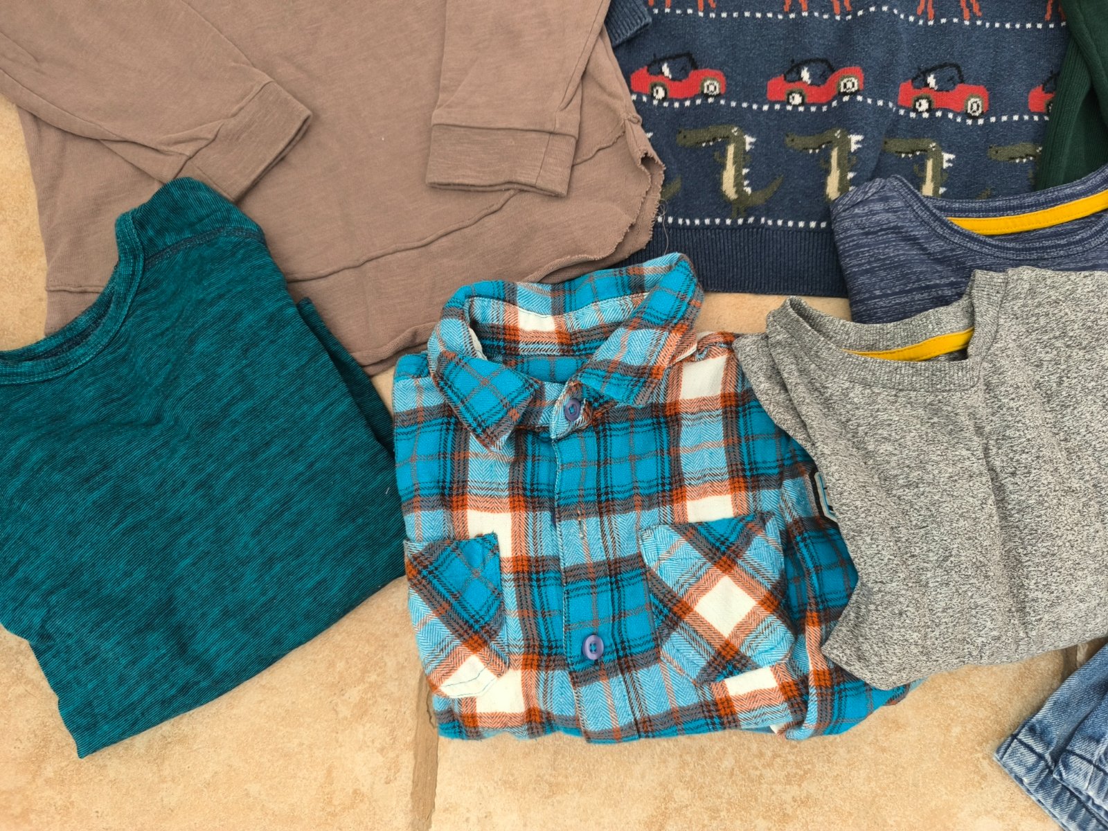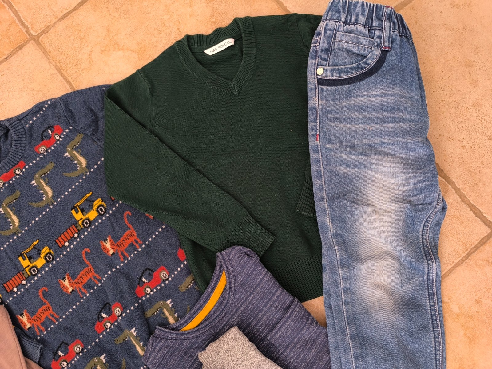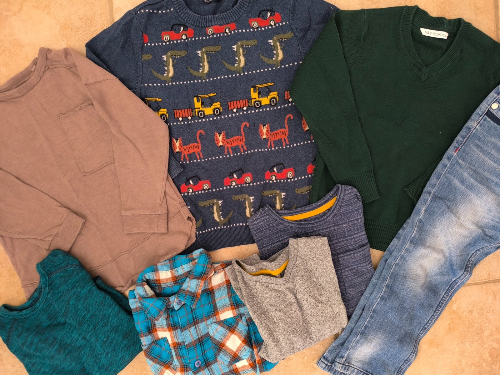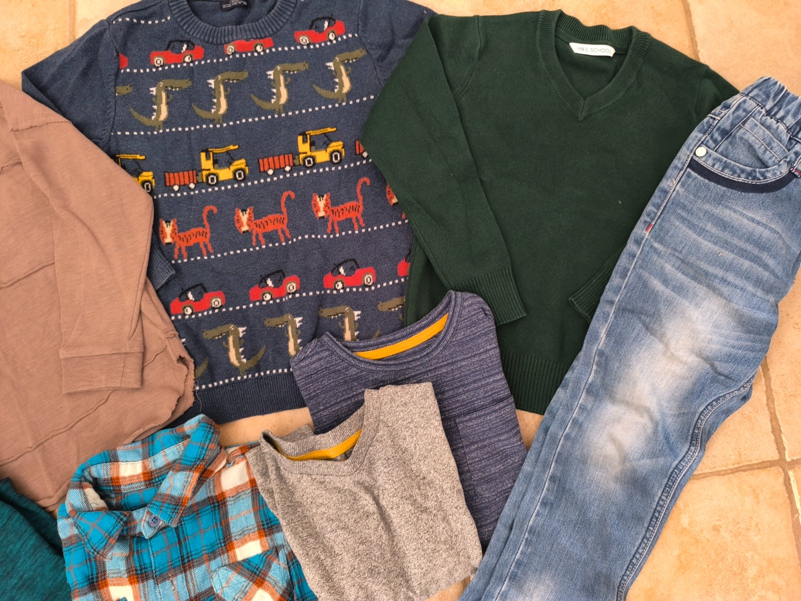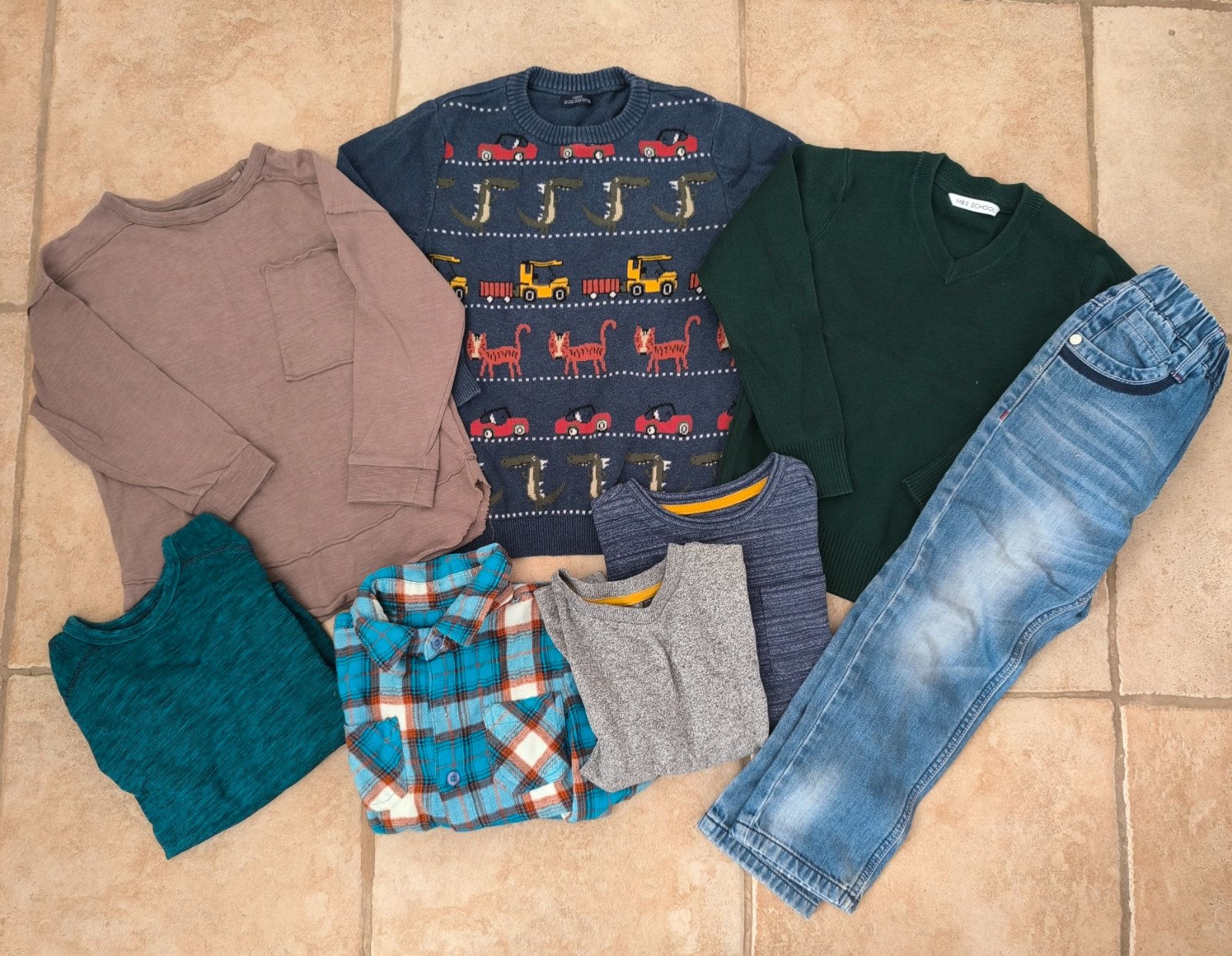 Mix oblečenia, veľkosť 110/116 2x mikina, obliekanie cez hlavu (jedna s kapucňou, druhá bez kapucne) 1x rifle 6x tričko s dlhým rukávom (jedno tričko s golierom)