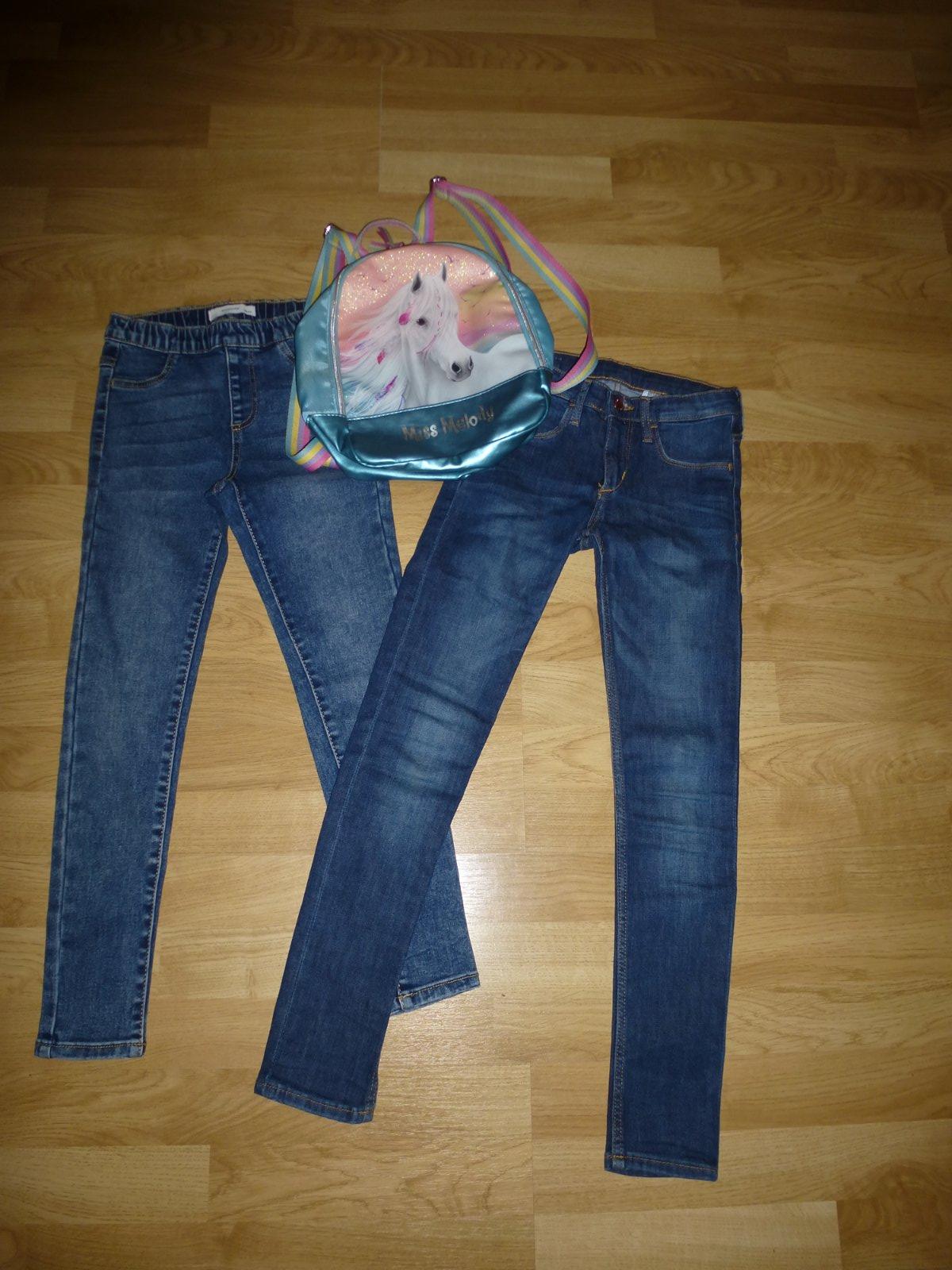2 kusy jeginsy zn. HM veľkosť 140, malinko nosené bez chýb a poškodení spolu s ruksačikom
