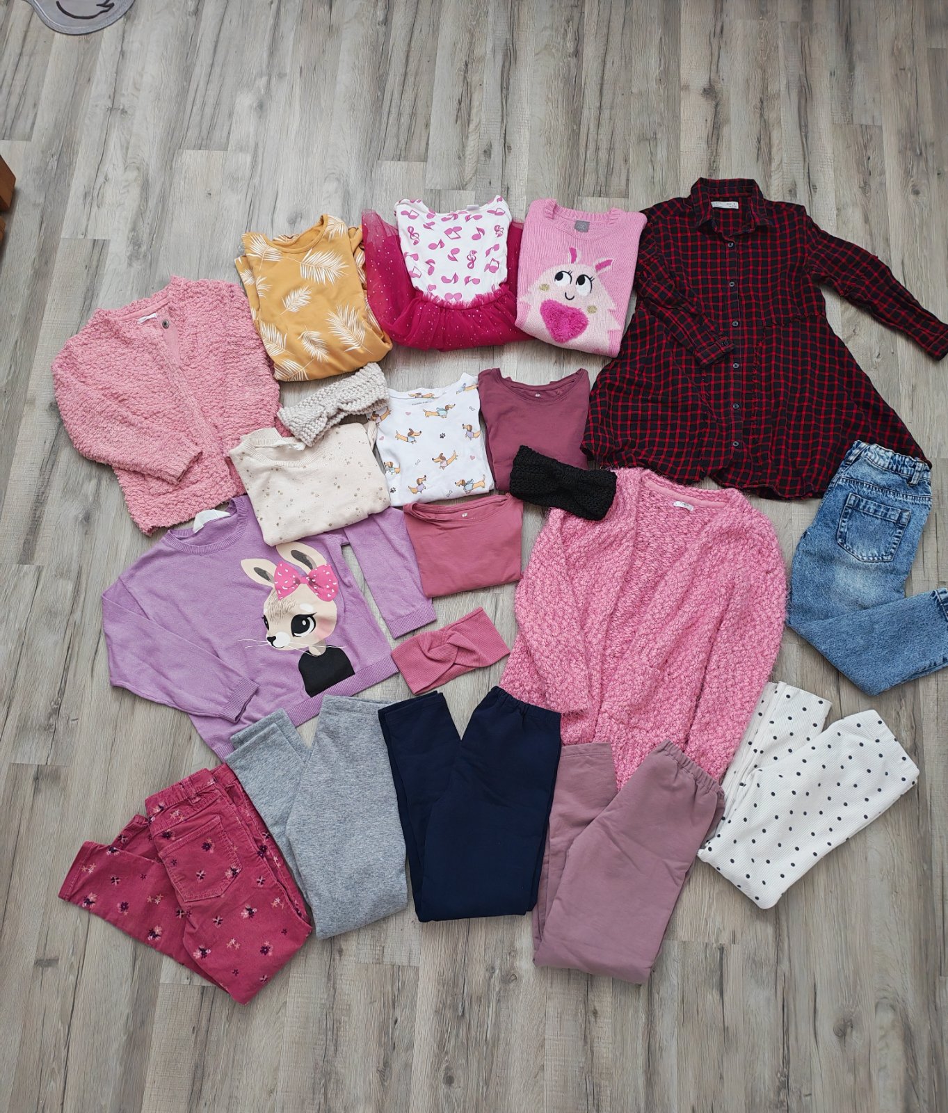 Pár kusov je veľ.110/116 ale väčšina je od 116 po 128. Niektoré kúsky nové alebo pár krát oblečené ale sú tam aj niektoré grátis na dopoužitie (tie v cene nie sú zahrnuté)
