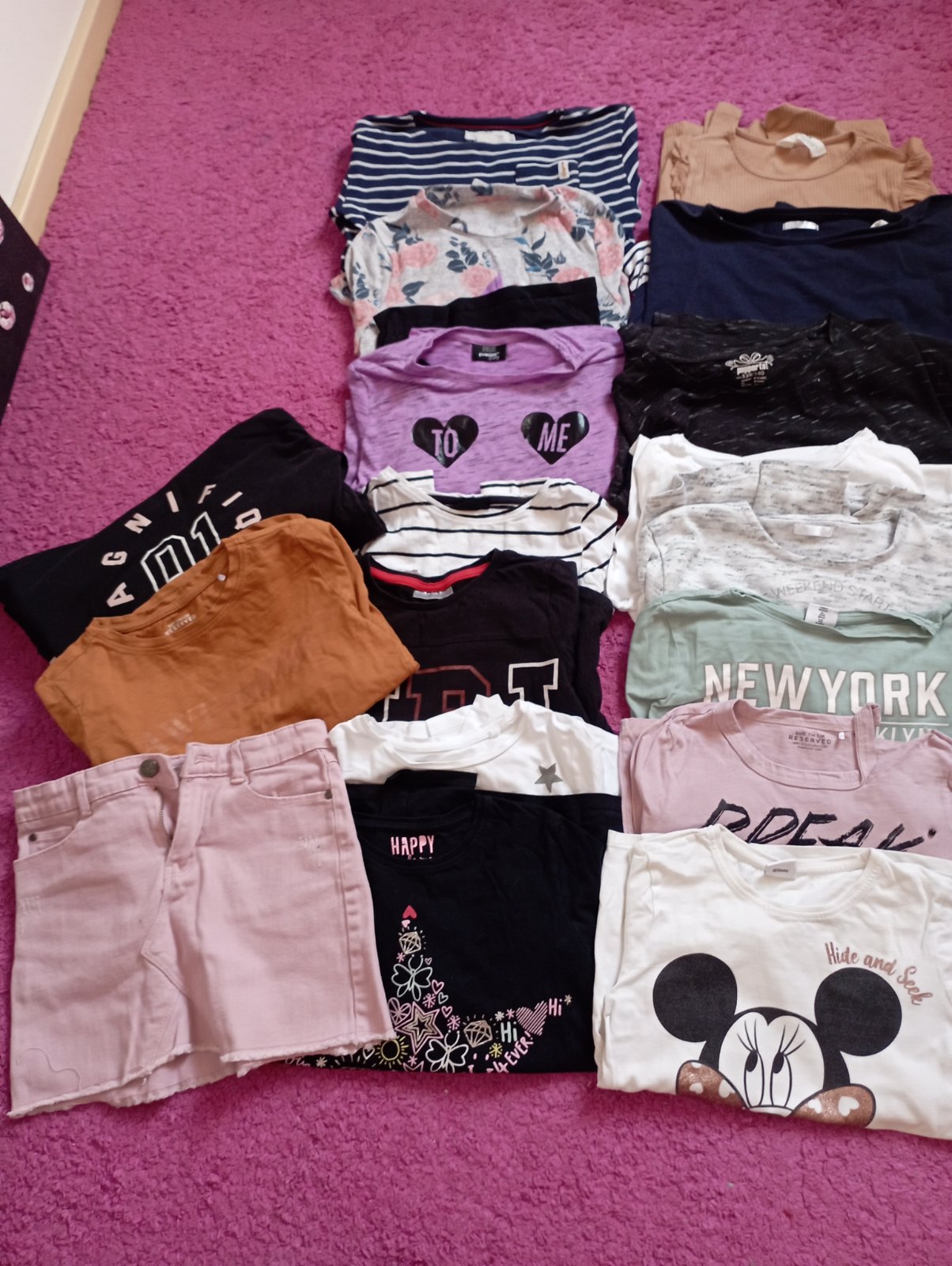 Balík oblečenia, veľkosť 134/140. Sú tam tričká s dlhým rukávom, sukňa, rifle, legíny,tepláky, svetre a mikiny.