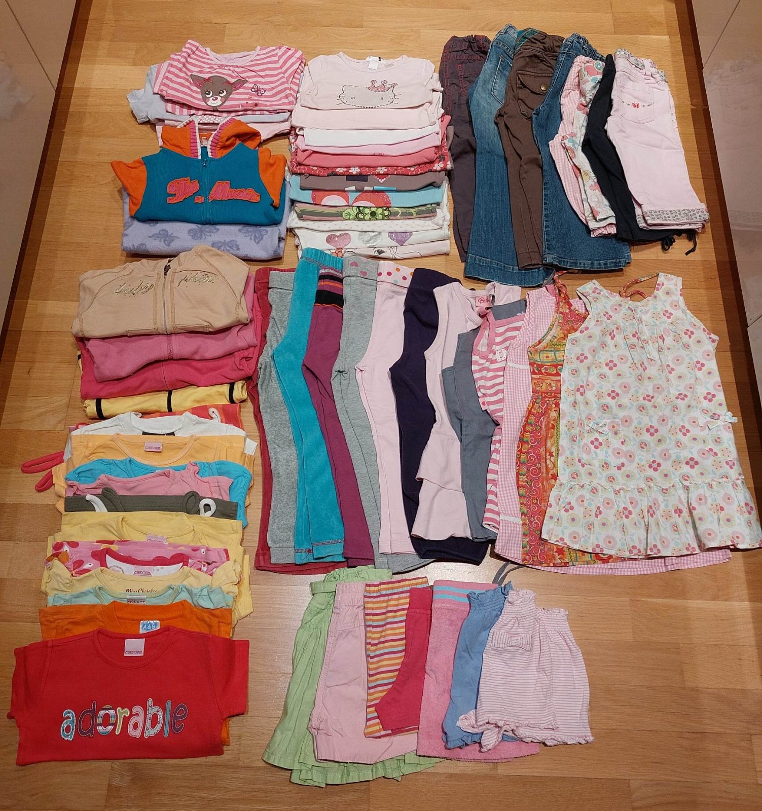 Predám 60 ks krásneho dievčenského oblečenia pre vek 3-4 roky (veľkosť č. 104). V balíčku nájdete značky Cherokee, Zara, Next, Mexx, H&M, C&A, Kenvelo-kids, Barbie. Balíček obsahuje tričká s dlhým rukávom, svetrík, fleece-ovú mikinu, klasické mikiny, tepláky, pyžamká, rifle, nohavice dlhé aj 3/4-ové, tepláky, sukničky, šaty, kraťasky, tričká s krátkym rukávom a aj letné tielka. Predávam iba ako balík, nie jednotlivo - preto som stanovila takto nízku sumu (menej ako 50 centov za kus). Väčšina vecí je vo výbornom stave, iba na niektorých je vidno mini známky nosenia. Osobný odber Bratislava - Ružinov.