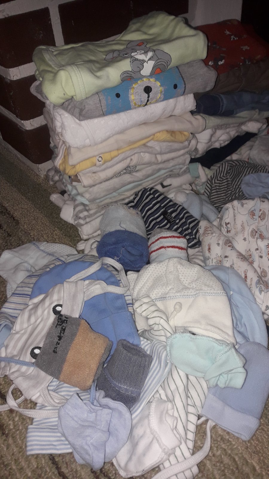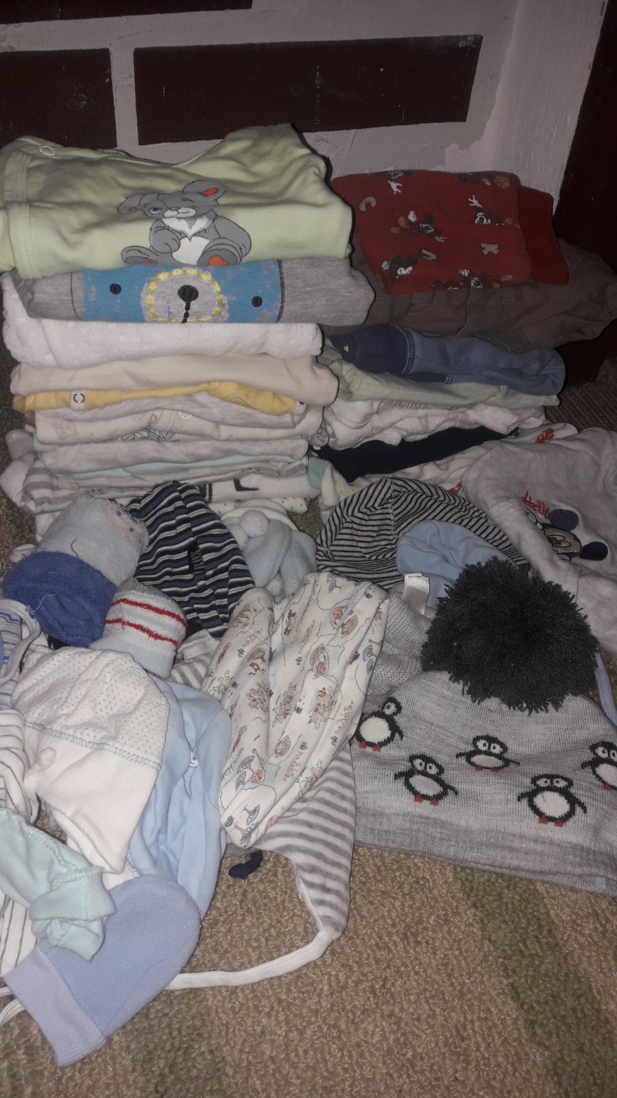 Veľký balík oblečenia pre chlapčeka. Obsahuje 4x tričiek, 1x svetrík, 2x overal na spanie, 3x dupačky, 2x polodupačky, 1x tepláčky, 5x body, 1x čiapočka, 6párov ponožiek, 1x papučky, 4x kabátik, 1x...