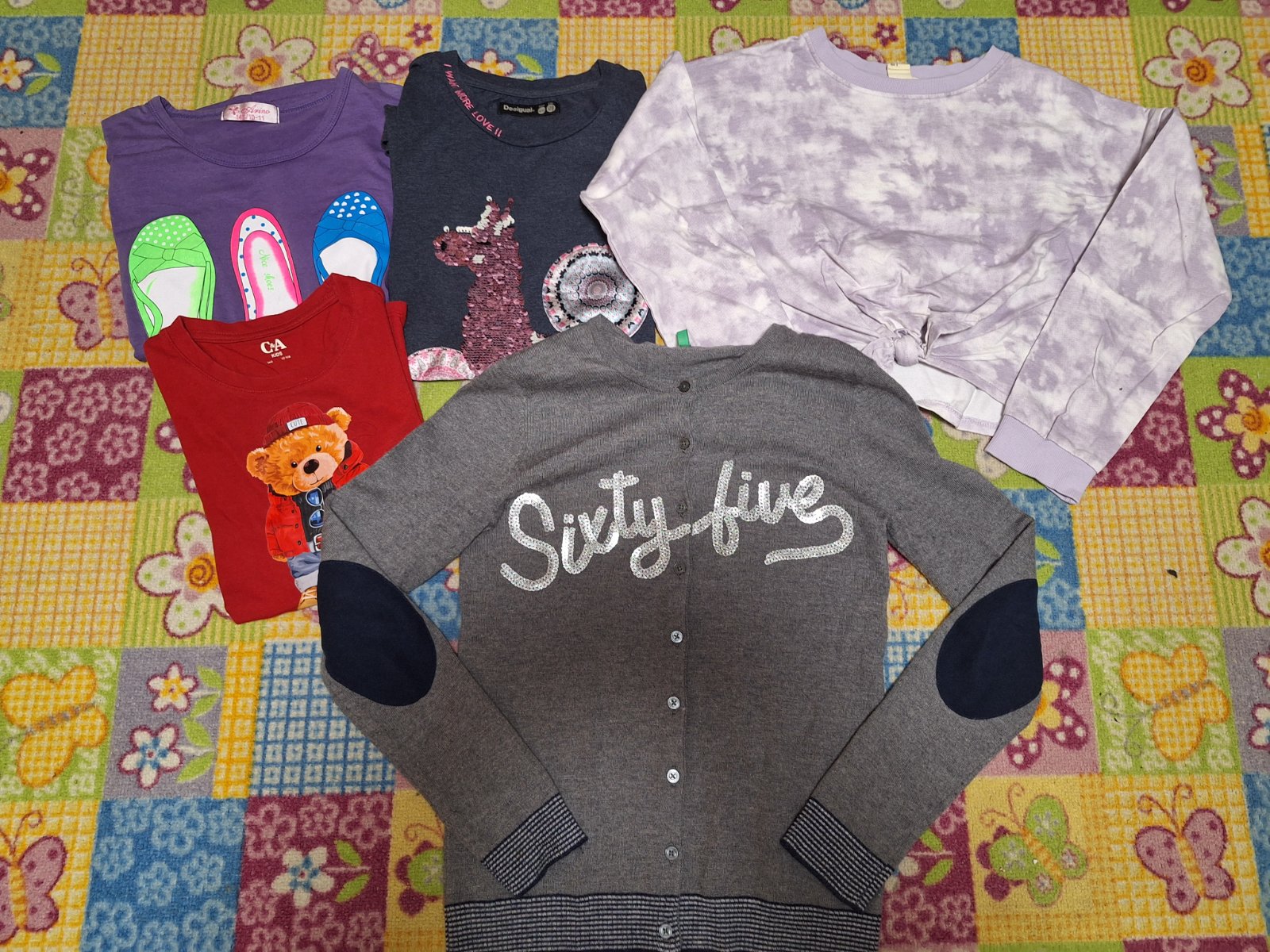 Fialové tricko 146 kr.rukav 1e, červené neakt, modre desigual 146 2,50e, mikina crop hm 146 3e, sveter neakt.