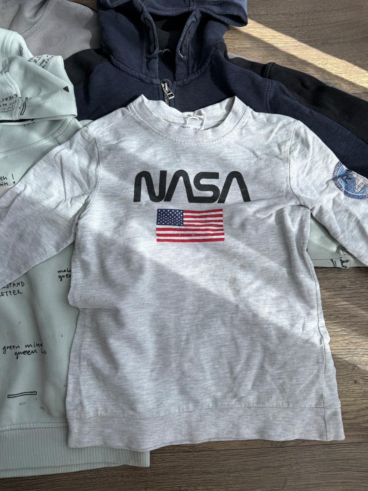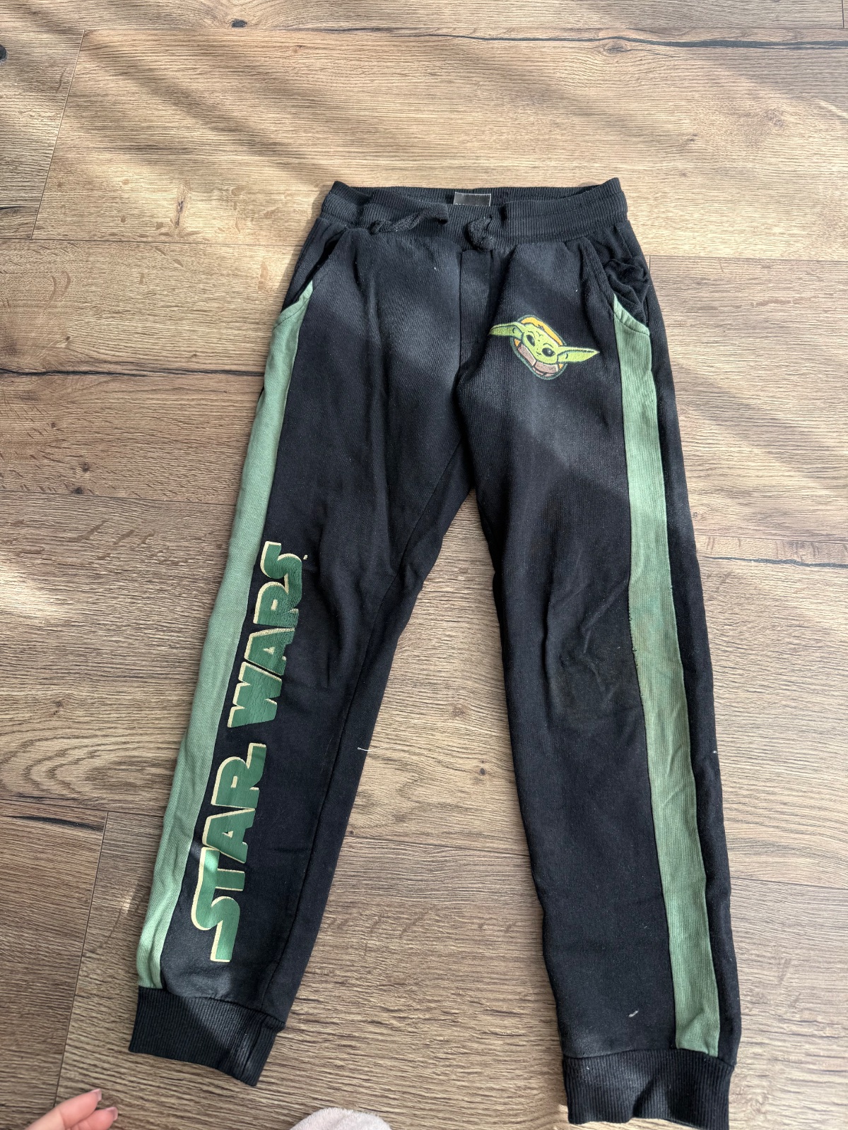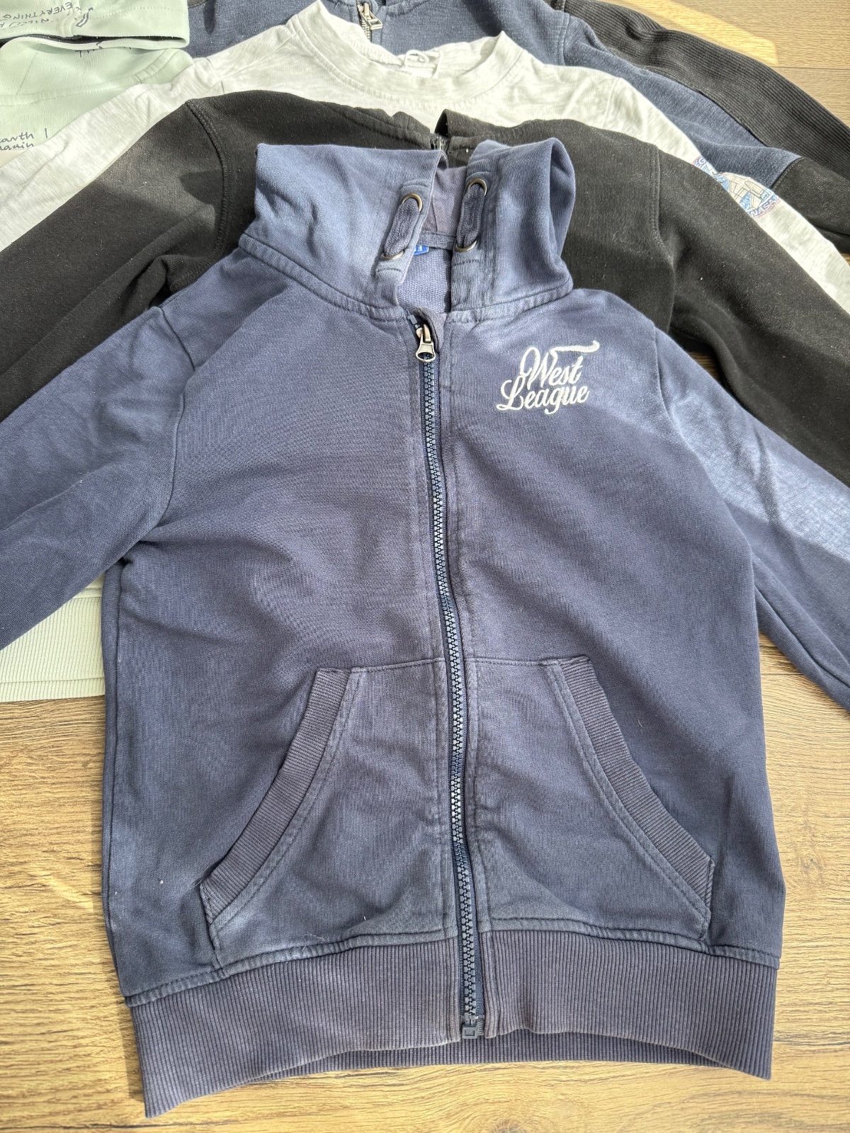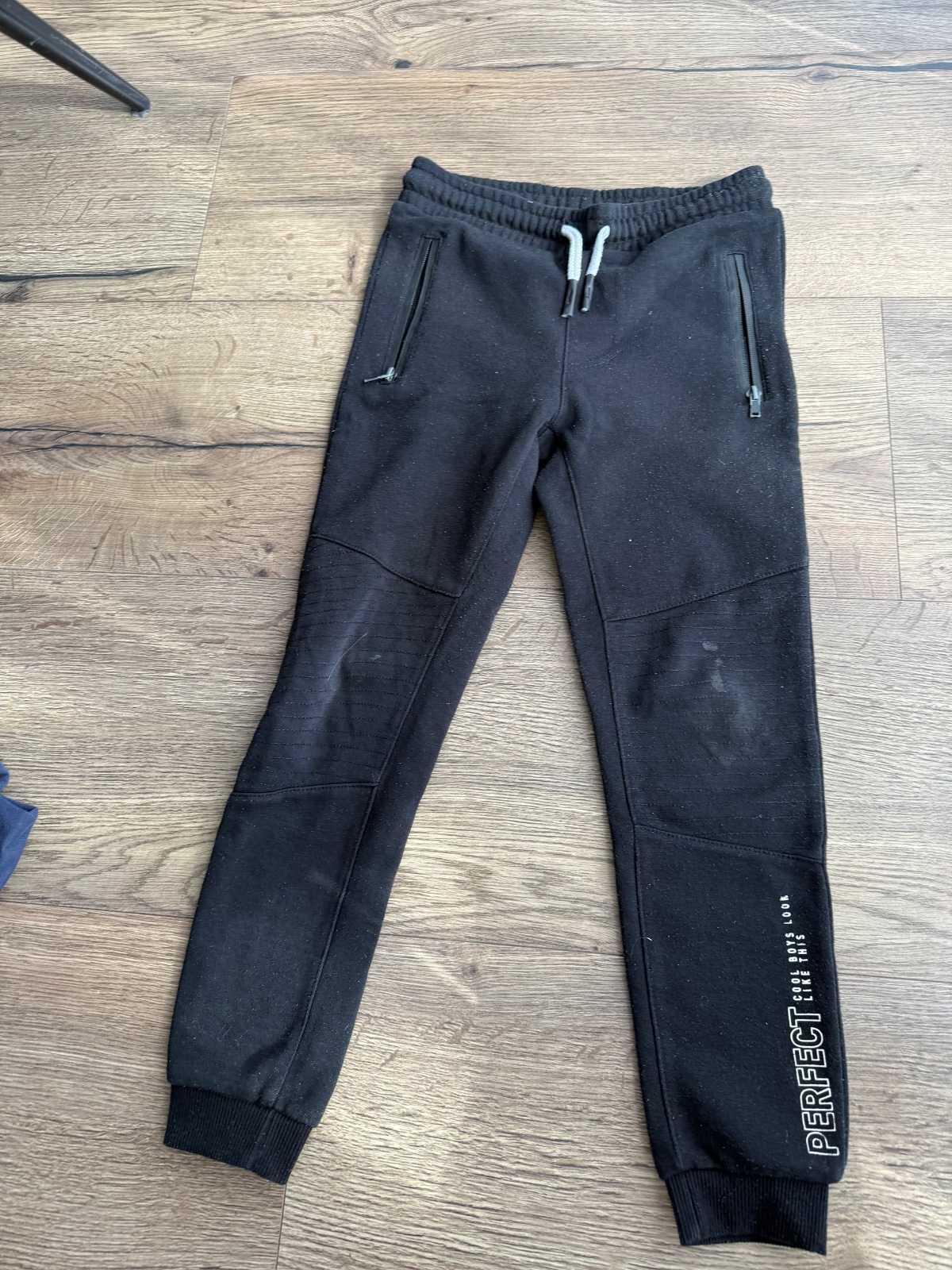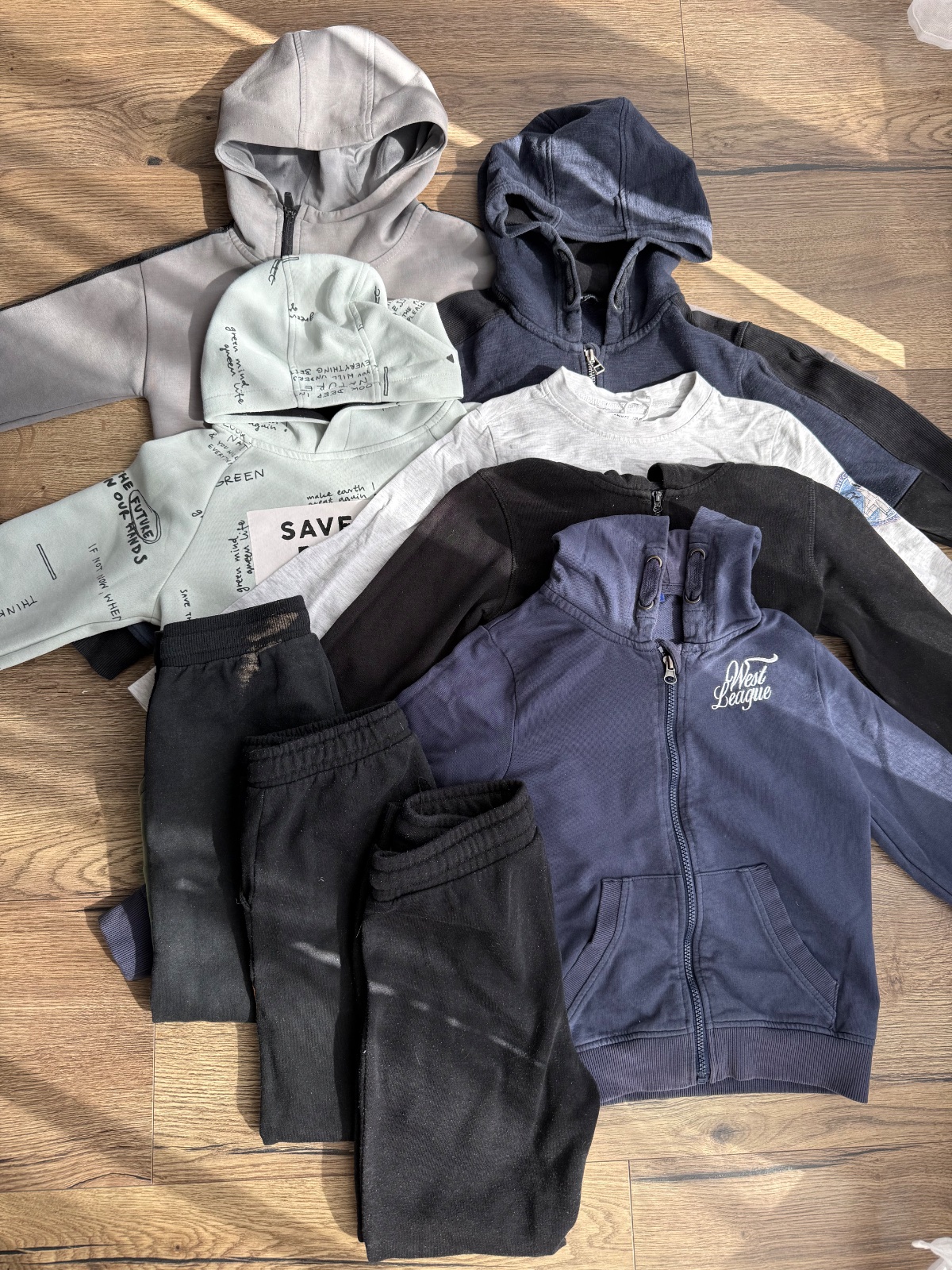 Balíček 6 ks teplákov vo veľkosti 122 cm vhodné do škôlky. Tmavo sive so "zubami" predane. Iba jedny bledosivé majú poškodenie, trochu zatrhnuté (ale neroztrhnuté) a malý fliačik, ale možno pôjde a...