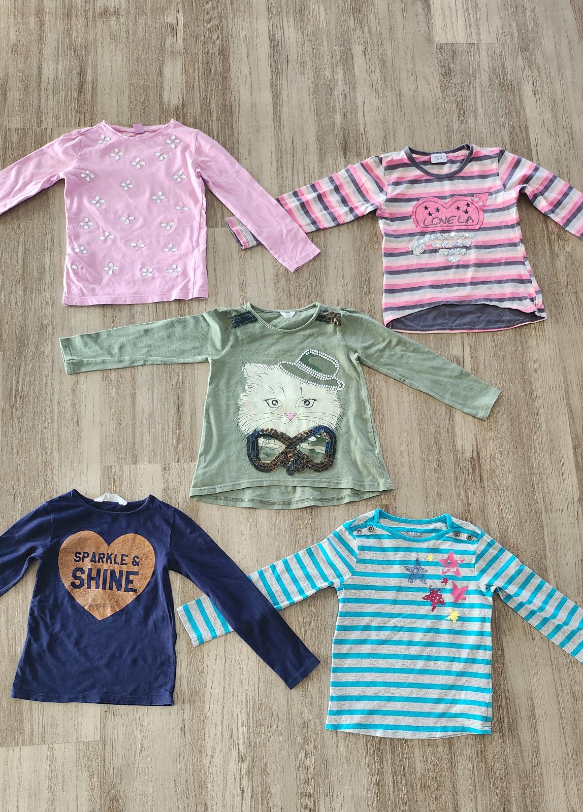 5ks tričiek veľkosti 110 -116.Tričko s mačičkou zaujímavej farby .Sú na nej kamienky a perličky.Ruzove je s filtrami ,zaujímavo riešená predná strana,je kratšia ako zadná.Pozri fotky.Značky H&M,Kids by Tschibo,Breeze.Všetko spolu cena 8 eur