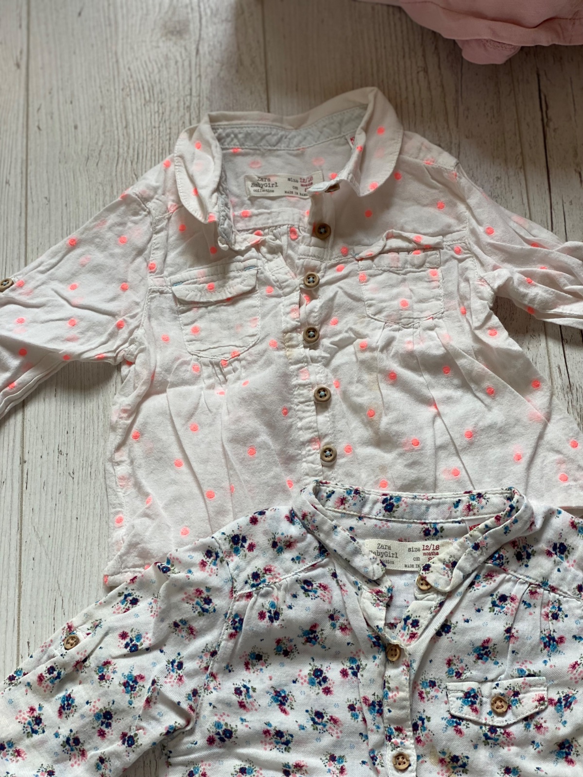 Balík dievčenského oblečenia vo veľkosti 86, 4x body s dlhým rukávom s volánikmi, 4x letný overal, 2x tričko, 2x krátke nohavice, 3x pulóver, 1x nohavice na traky, 1x šaty s dlhým rukávom, 1x mikin...