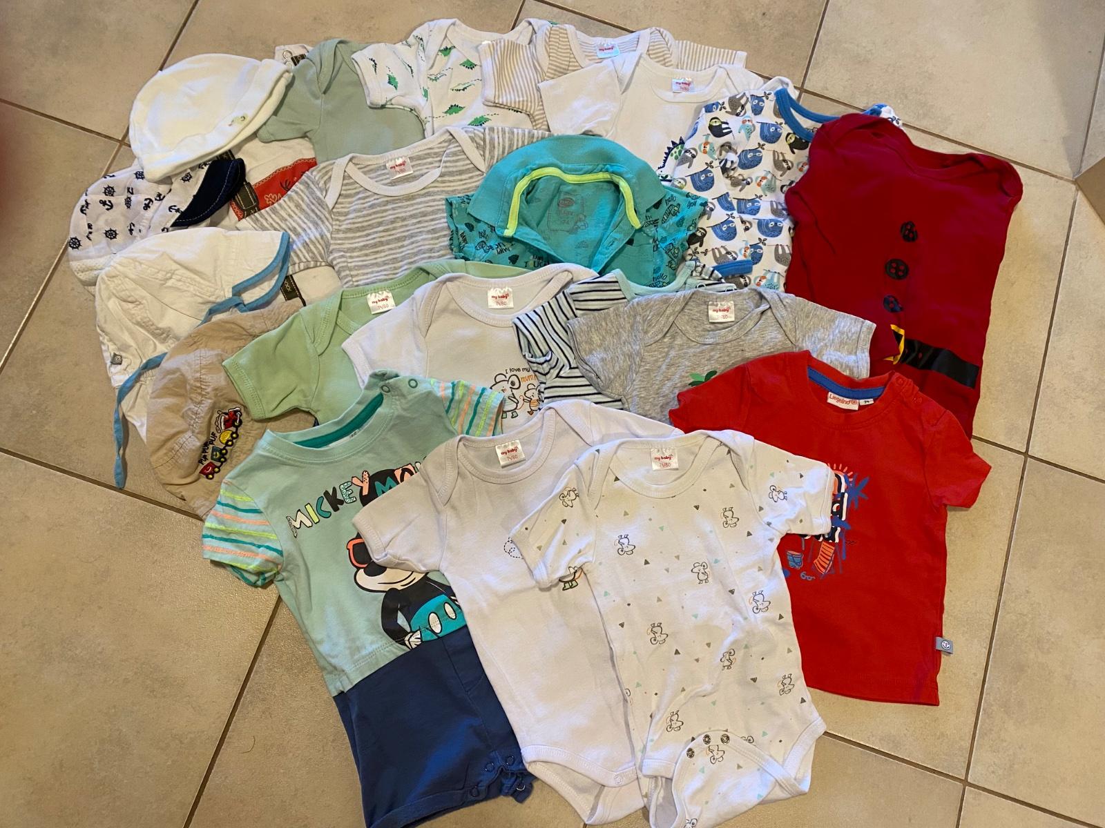 Balík letného oblečenia vo veľkostiach 62-68. 9x body krátky rukáv 1x krátke nohavice na traky 2x "overal" krátky 2x tričko krátky rukáv 3x tenučké nohavice 1x súprava body, kraťasy a čiapočka ...