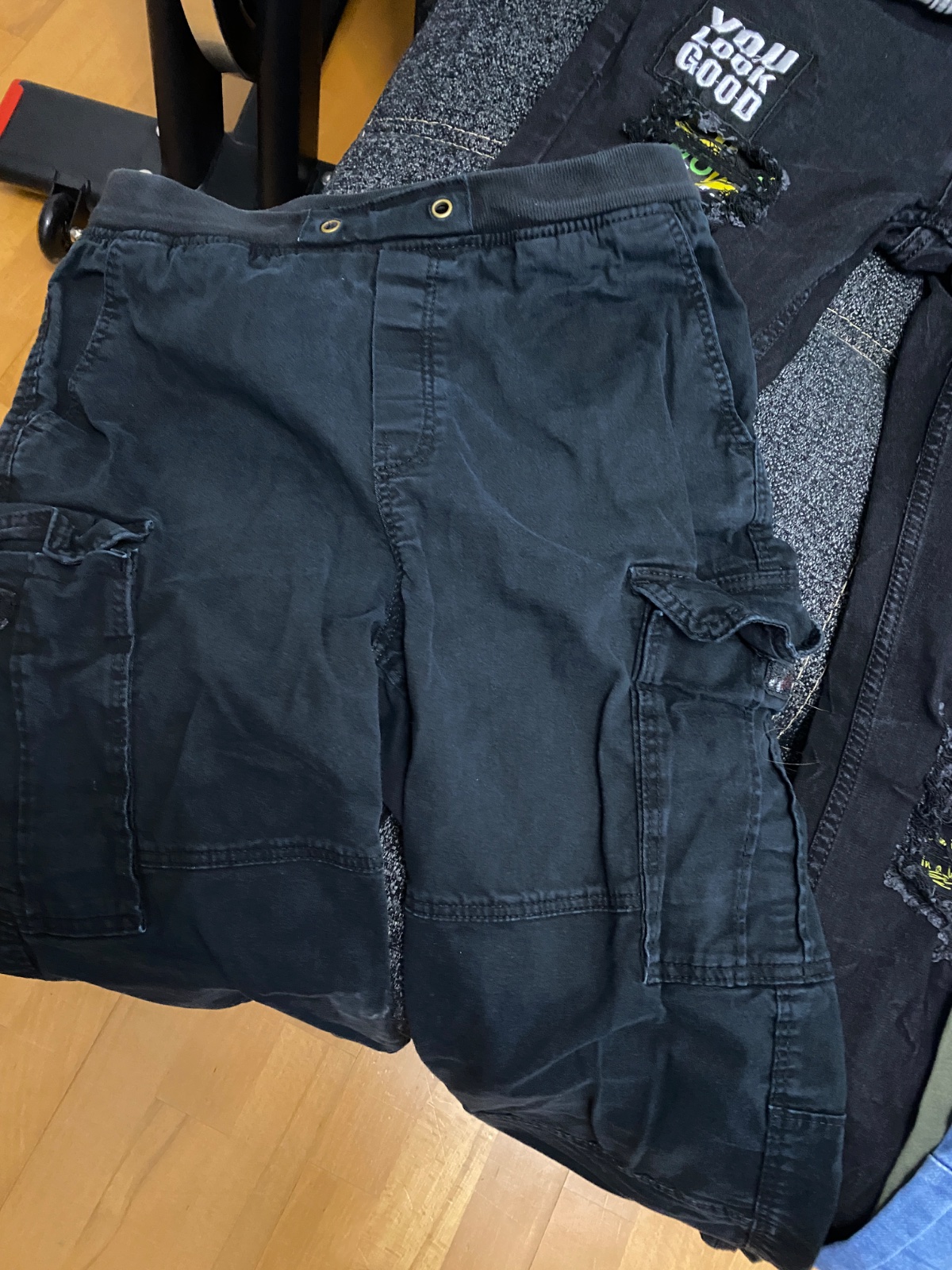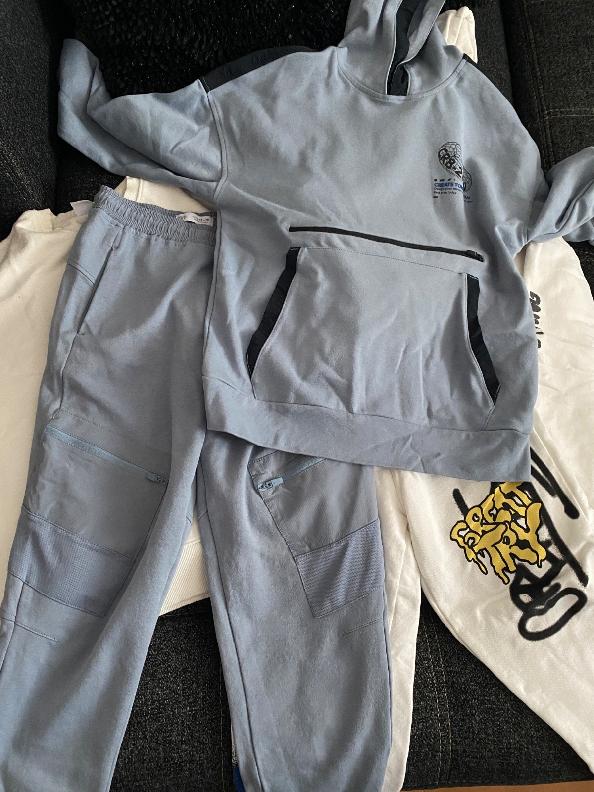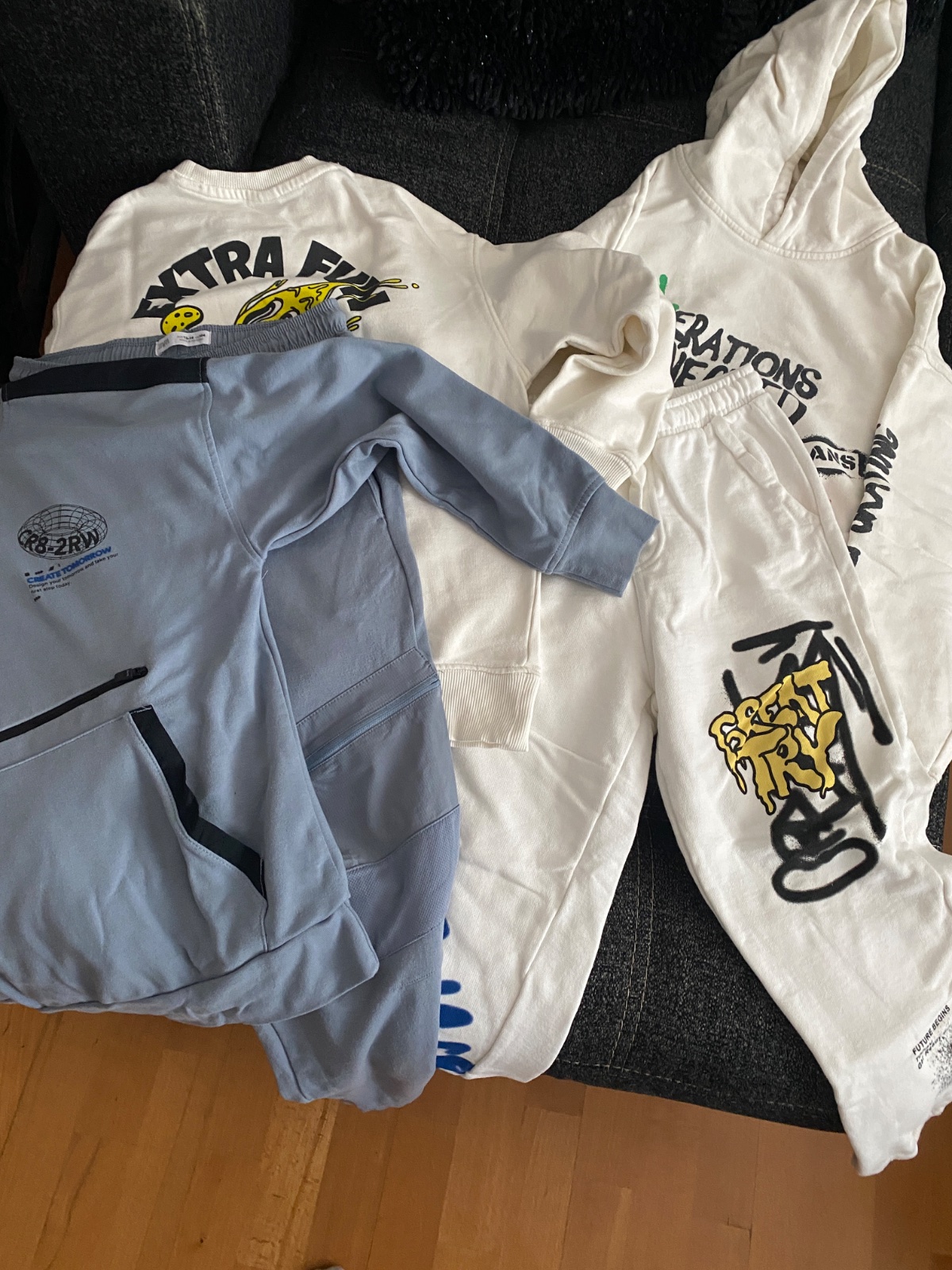Predám balík oblečenia po synovi. Modré šortky veľkosť 158 Biele šortky cca 158 (už je zošúchané číslo) 3/4 nohavice veľkosť 152 Čierna mikina 164 Modrá mikina 164 modré tričko 152 čierne tričko 158