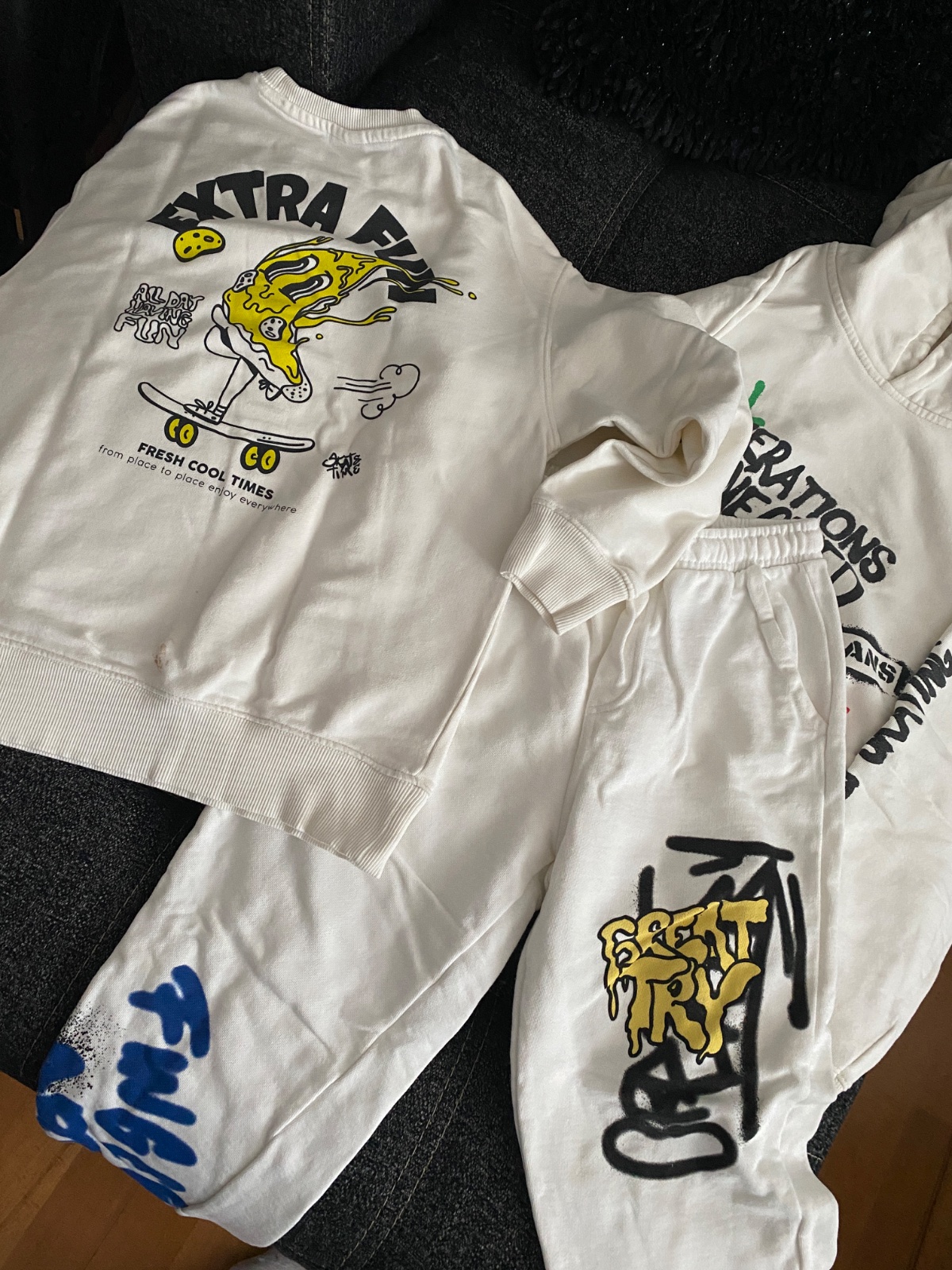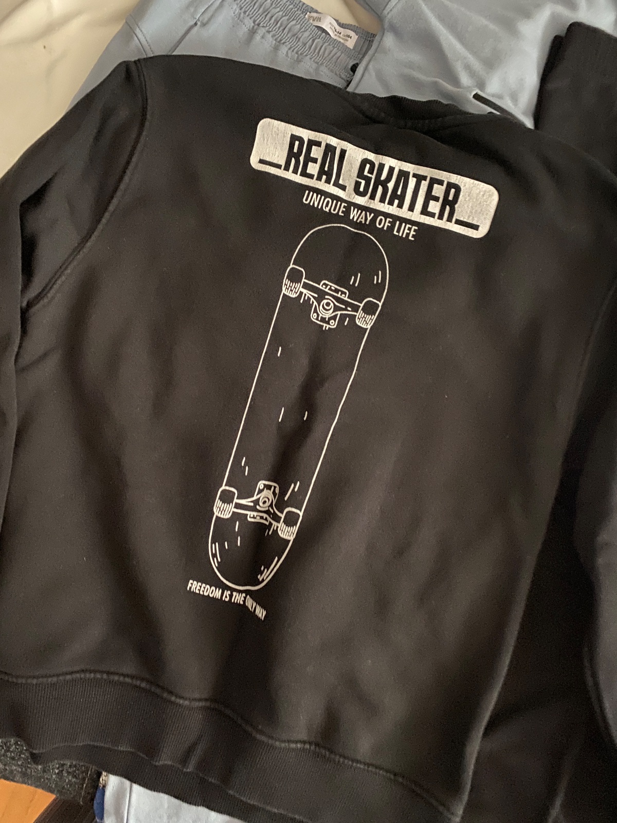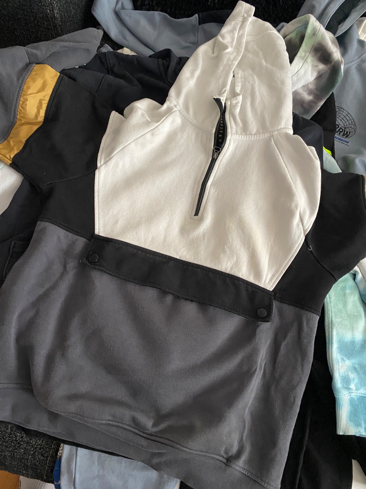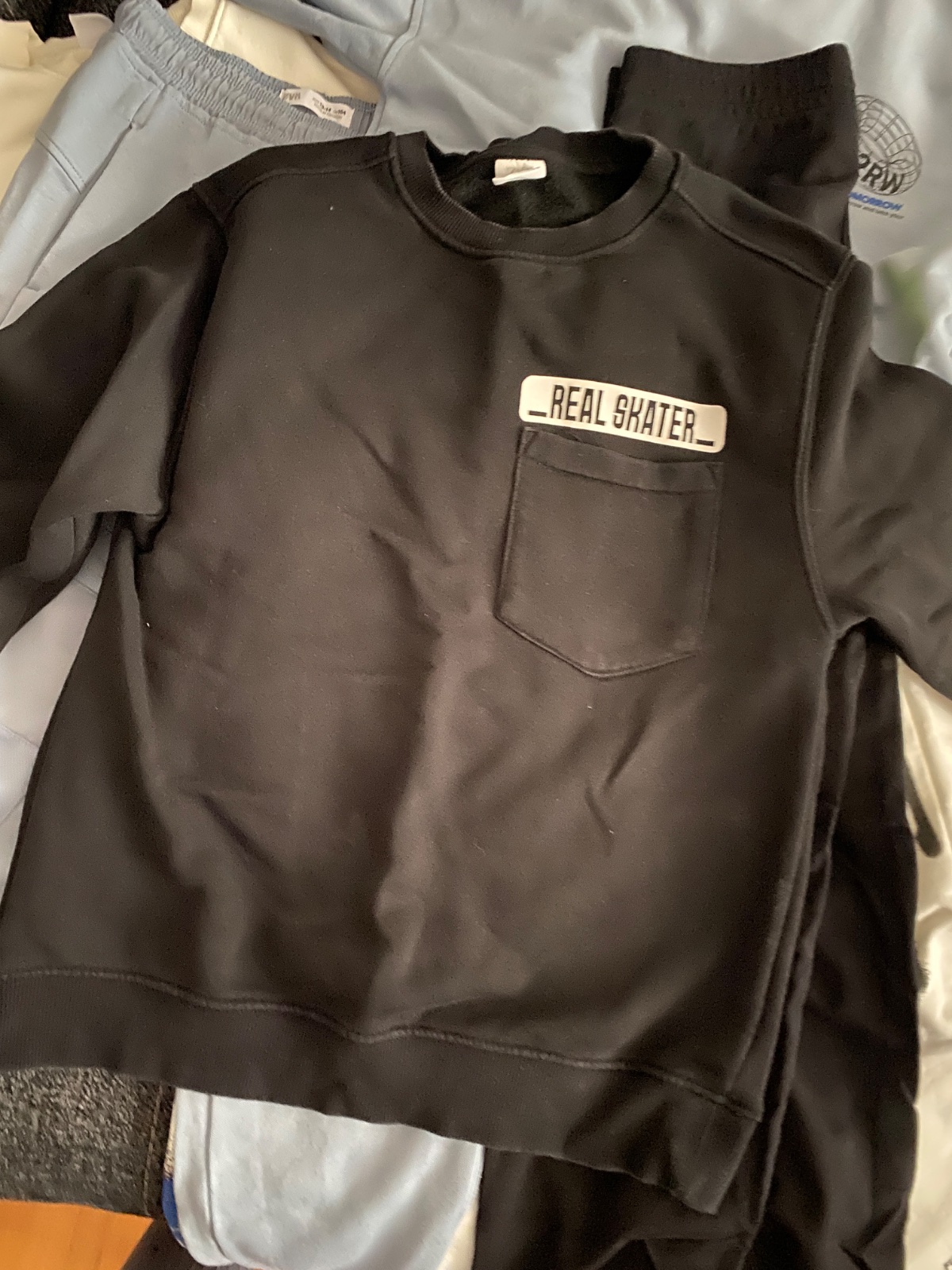Predám balík oblečenia po synovi. Modré šortky veľkosť 158 Biele šortky cca 158 (už je zošúchané číslo) 3/4 nohavice veľkosť 152 Čierna mikina 164 Modrá mikina 164 modré tričko 152 čierne tričko 158