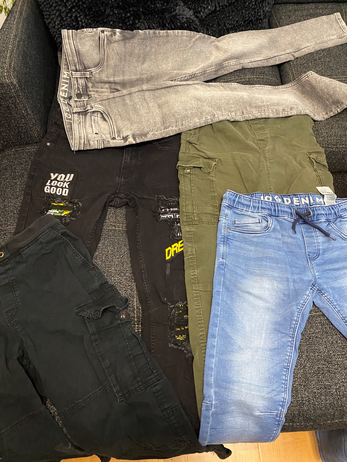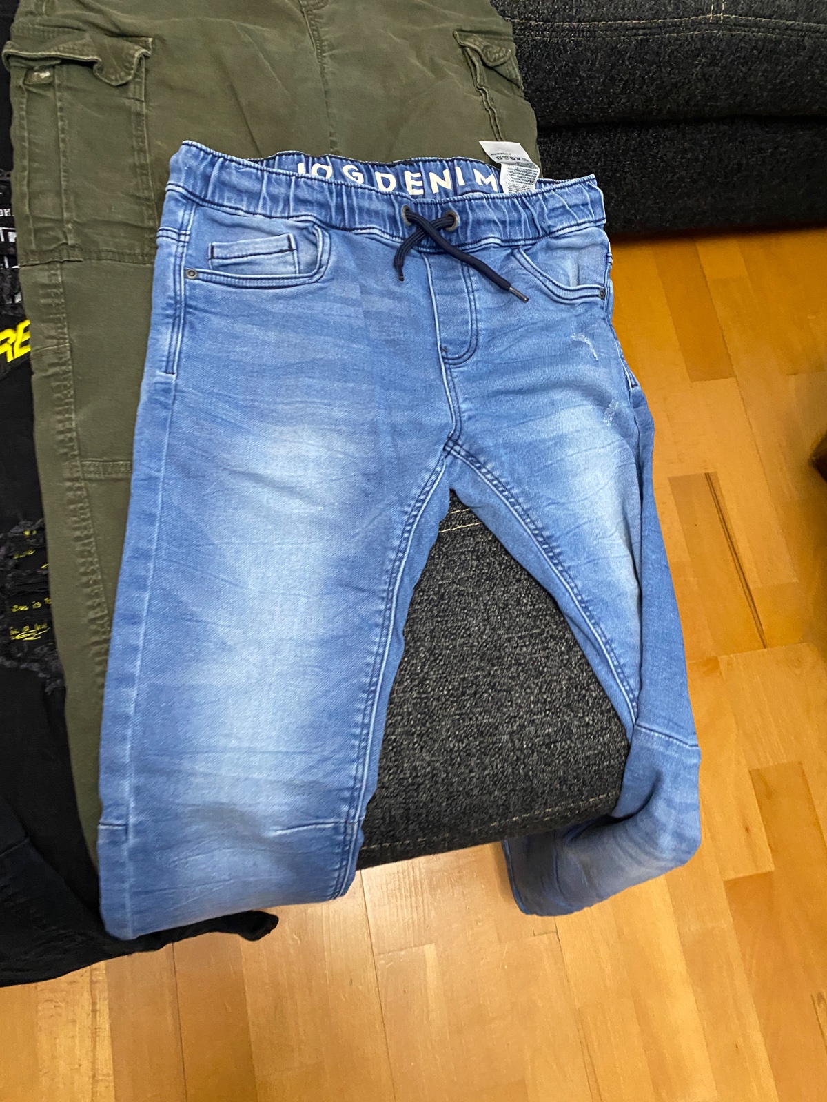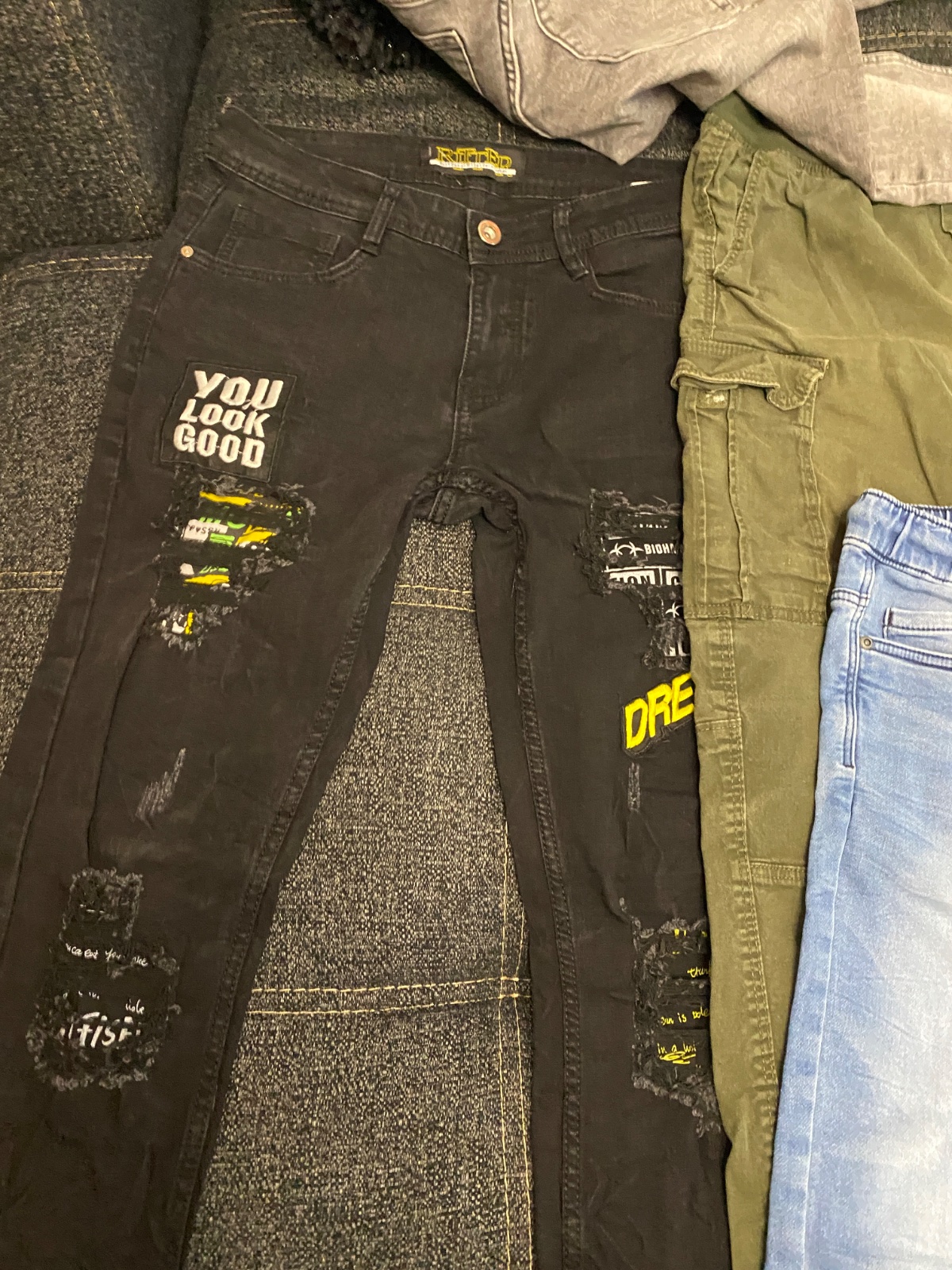 Modré rifle, veľ. 164, vo veľmi dobrom stave, pás sa dá prispôsobiť, je na gumu, cena 4€ Čierne rifle, veľ. 158, boli len pár krát oblečené, v perfektnom stave, vhodné aj na slávnostné príležitosti...