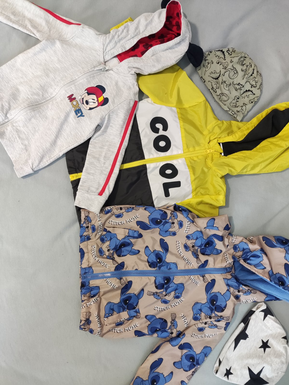 Veci sú málo nosené,akurát na bunde Stitch,treba zašiť rukáv.