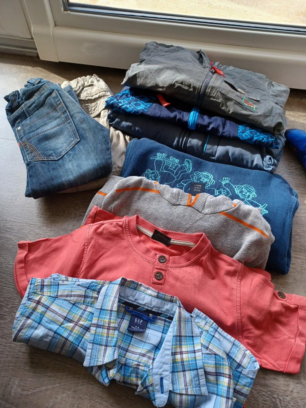 Všetko veľkosť 116, vesta, rifle (roztrhané kolená majú byť), tepláky a tričko s krátkym rukávom. Nosené bez poškodení.