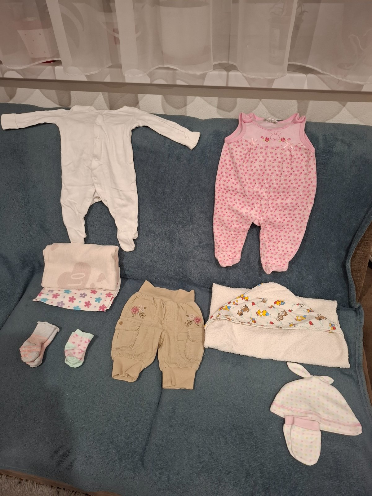 Ponukam na predaj multipak: pyžamko, dupacky, nohavice, osuška,veľká plienka, klasická plienka, ponožky tenšia čiapka a rukavičky