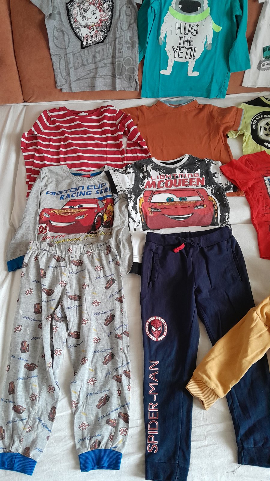 Predám balík oblečenia. Veľkosť 116. Obsahuje 4 x tepláky a 4x tričká s dlhým rukávom.