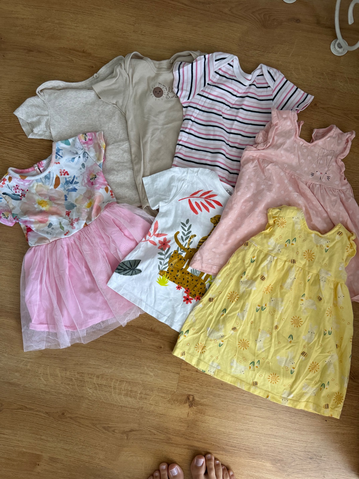 Veľmi dobrý stav, všetko veľkosť 3T. Šaty nosene bez poškodenia, košeľa ako nová, tričko modré nosene bez poškodenia, čierny rolak nenoseny len otrhnuta visačka, na leginkach vidiet pranie, mikink...
