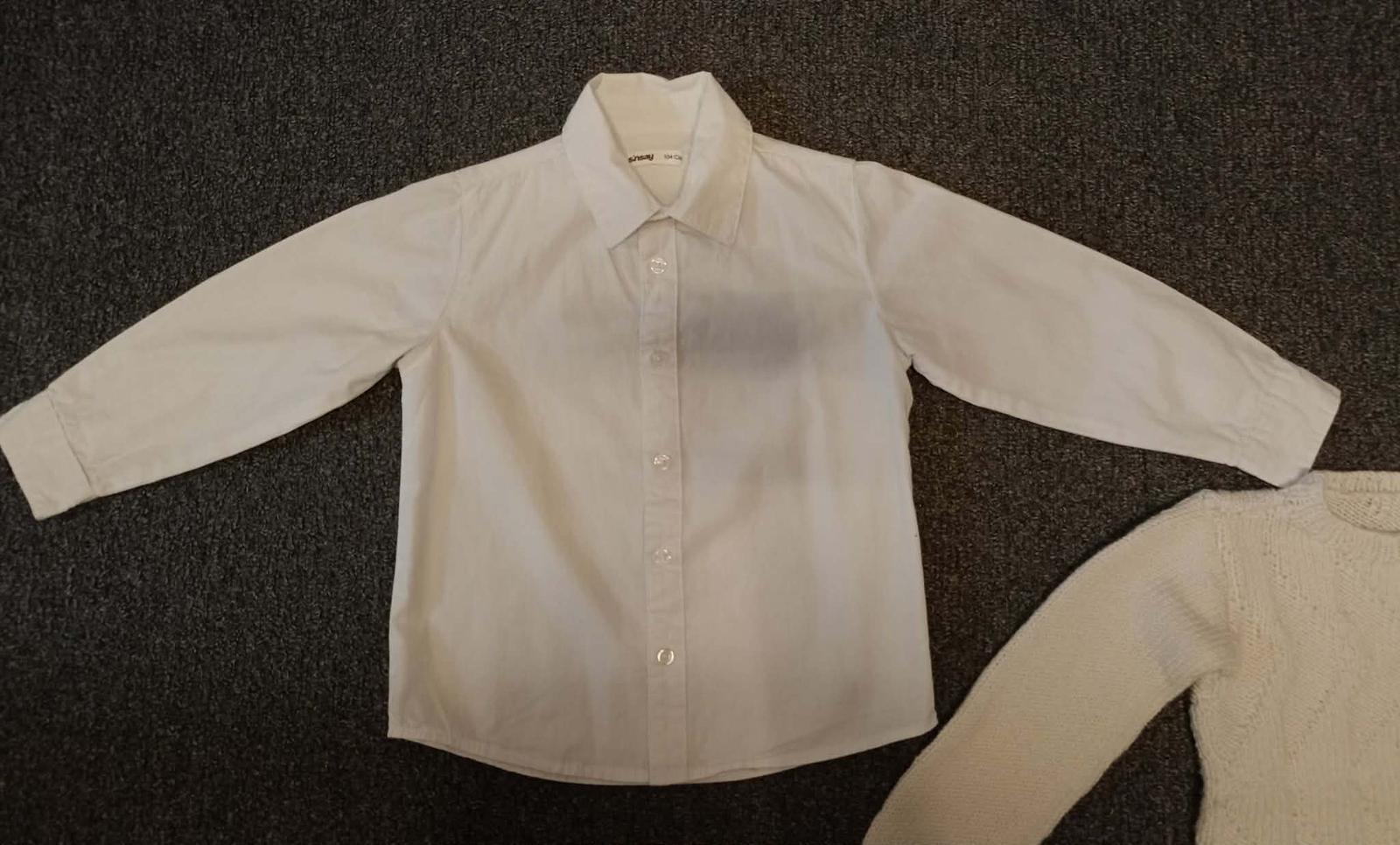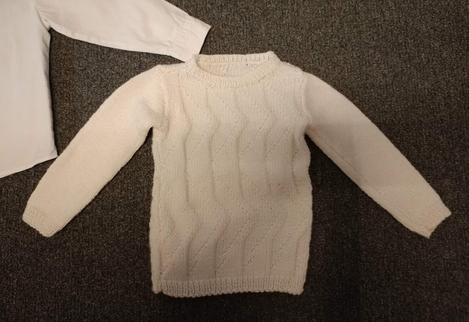 Predám bielu chlapčenskú košeľu, biely pulóver /ručne pletený/ + modrý motýlik na gumičku.