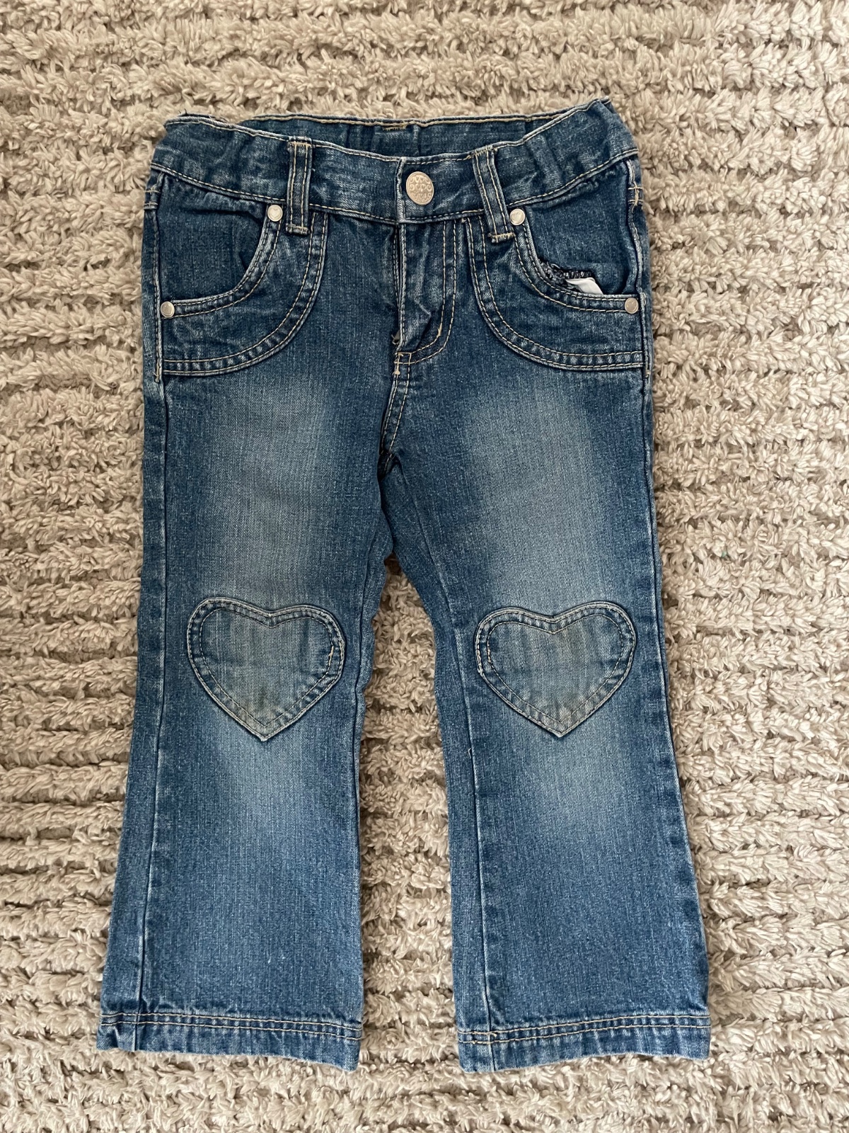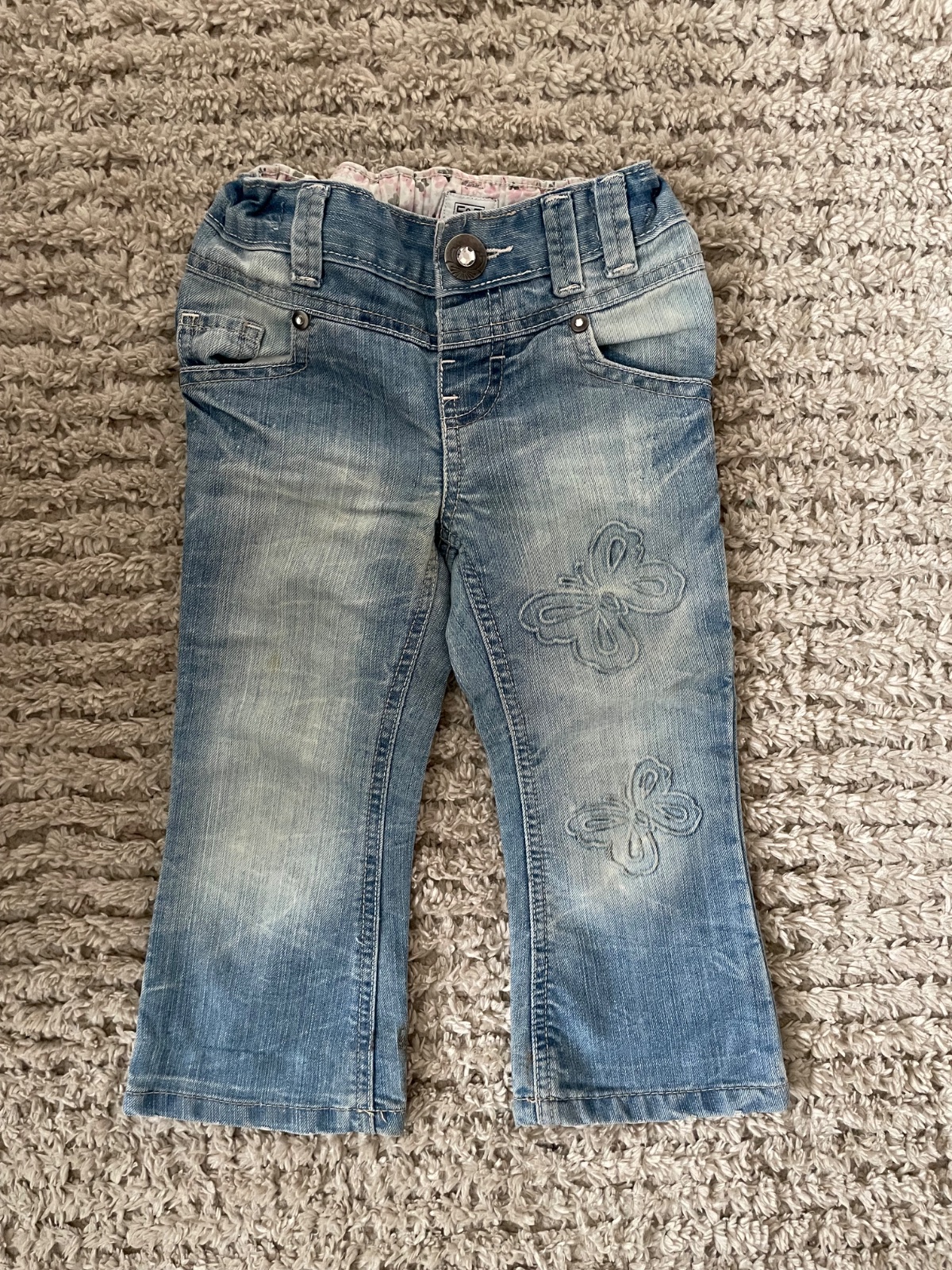 10. a 11. Svetlomodré rifle veľkosť 98 značka F&F materiál vrchná časť 70% bavlna 30% polyester vnútorná časť 52% polyester 48% bavlna, na 11. fotke vidno fliačik na kolene cena 0,50€
