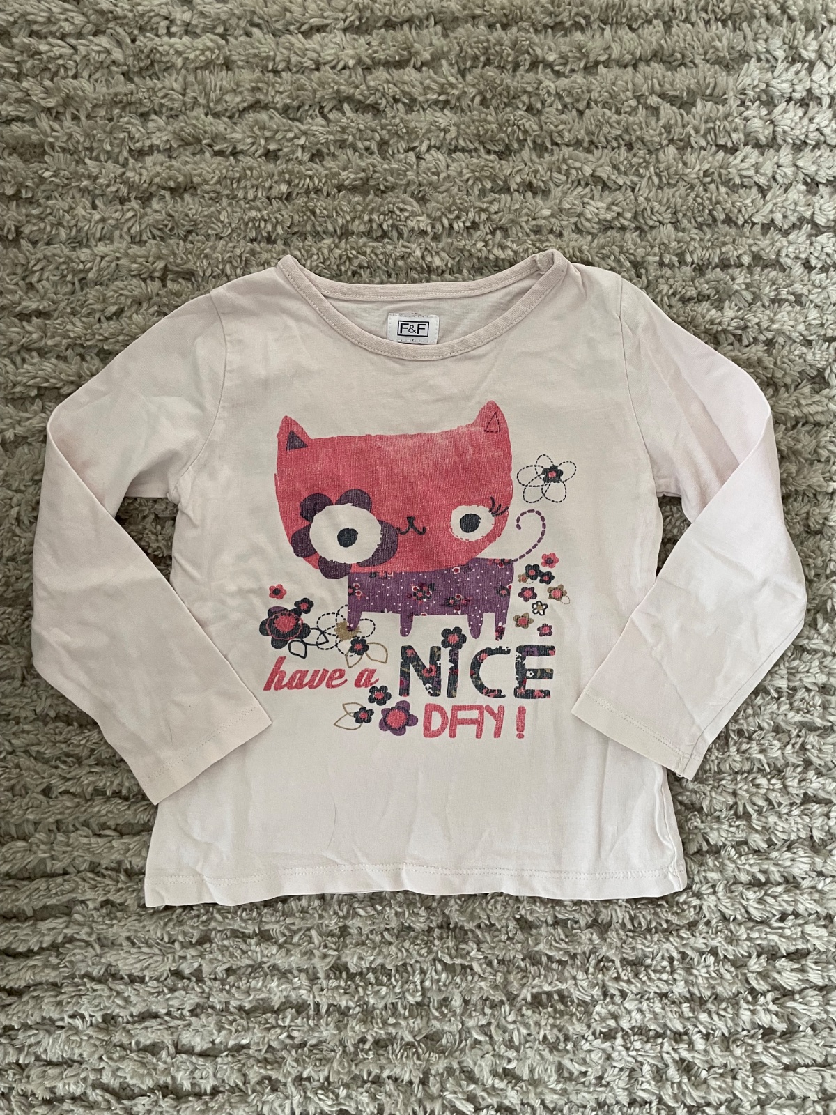 7. Tričko s mačičkou veľkosť 98/104 značka F&F materiál neviem, ale asi bavlna, cena 1€