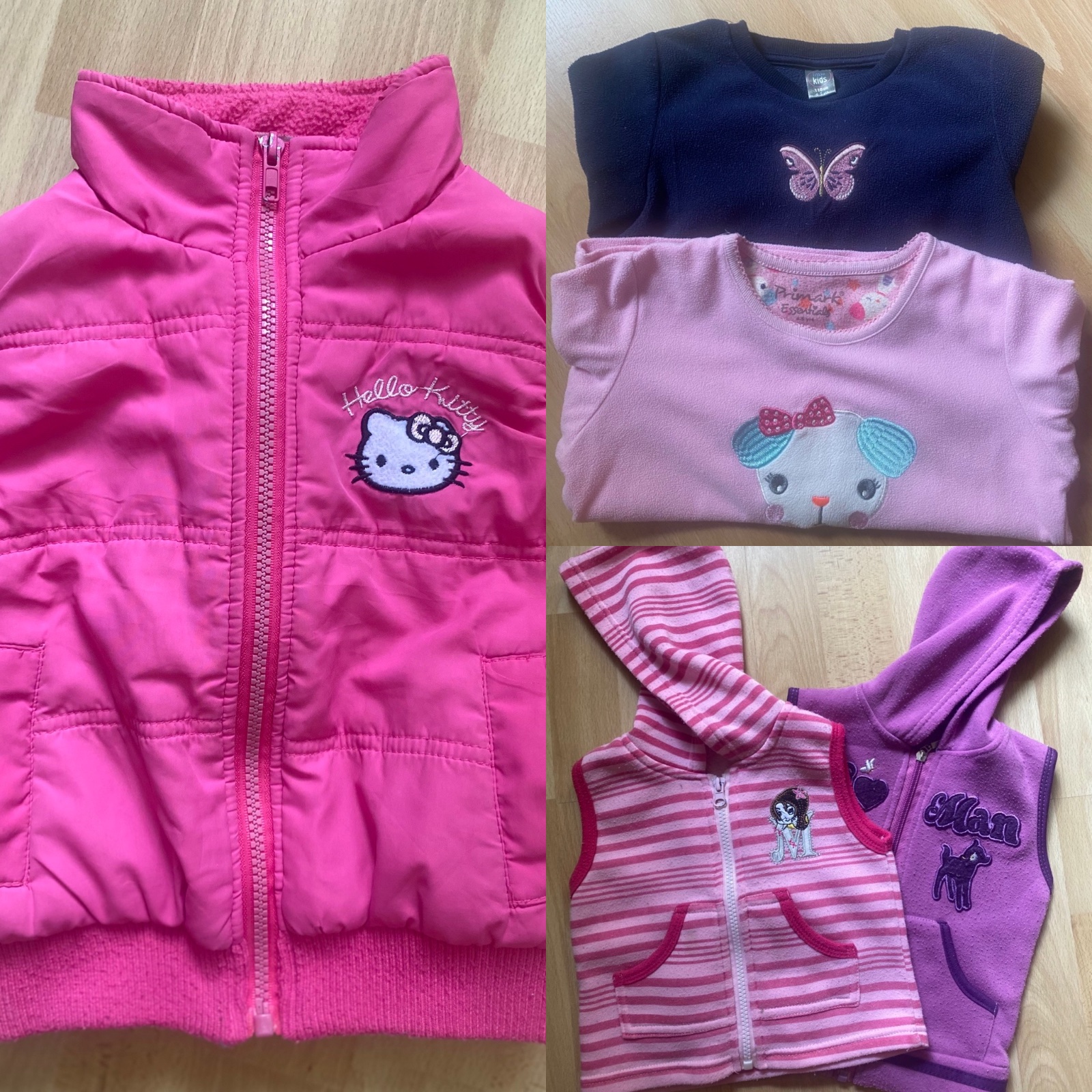 Flisove mikiny, teplakove vesty na zips a podsita vesta Hello Kitty. Stav nafoteny.
