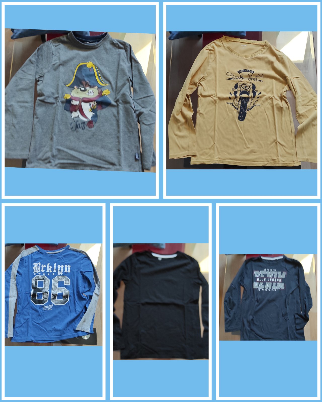 Mix oblecenia, teplsty a modre tricko oblecene 1x, zeldne nosené, nez poskodeni nslepky. Cena spolu 16€.