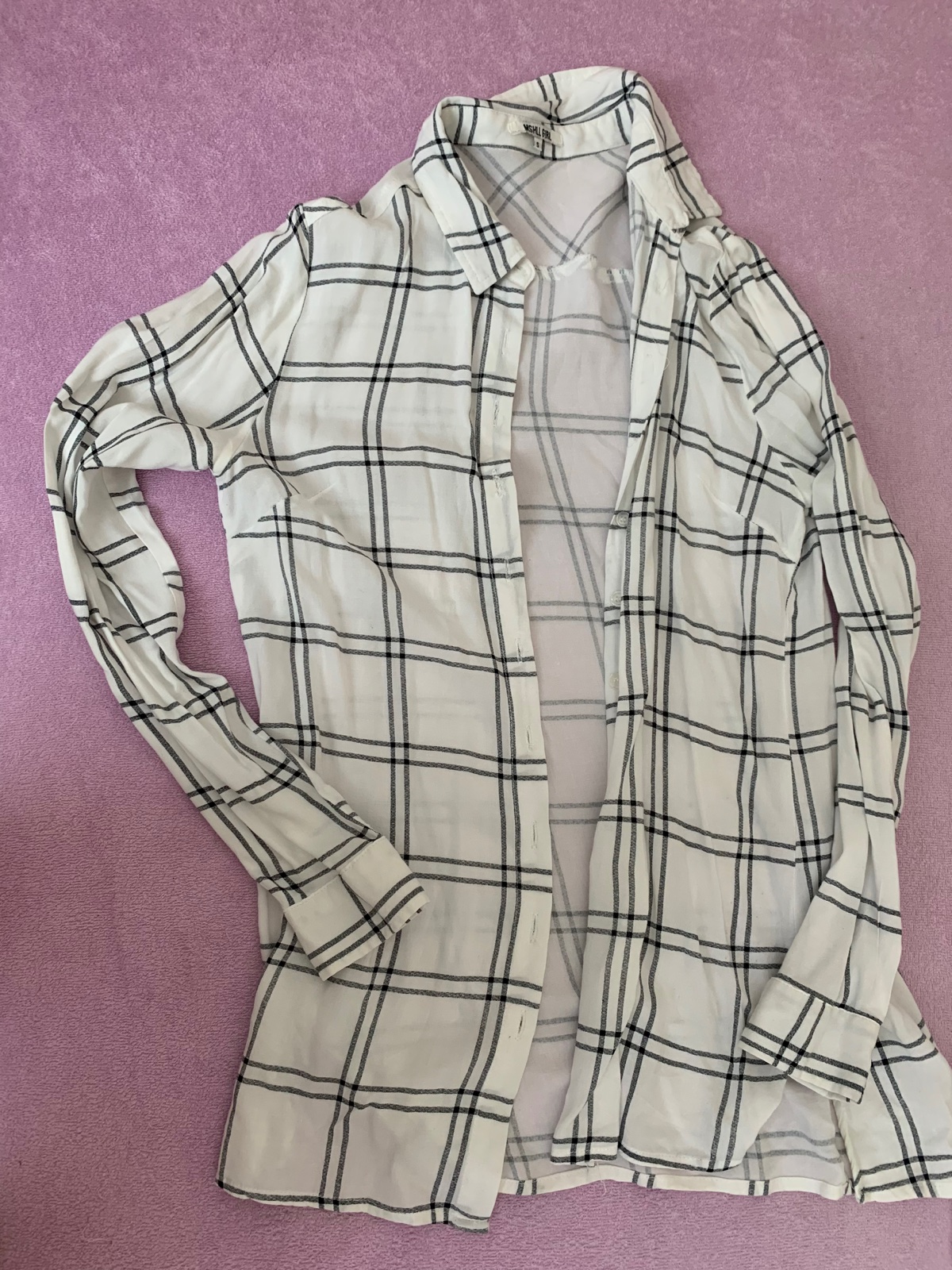 Balíček obsahuje slim šedé džínsy Rinascimento (4€), biely top bez rukávov s peter pan golierikom H&M (3€) a veľmi chic boxy shirt - cropped oversized žlto-bielu košeľu Topshop (4€). Vsetko vel. S ...