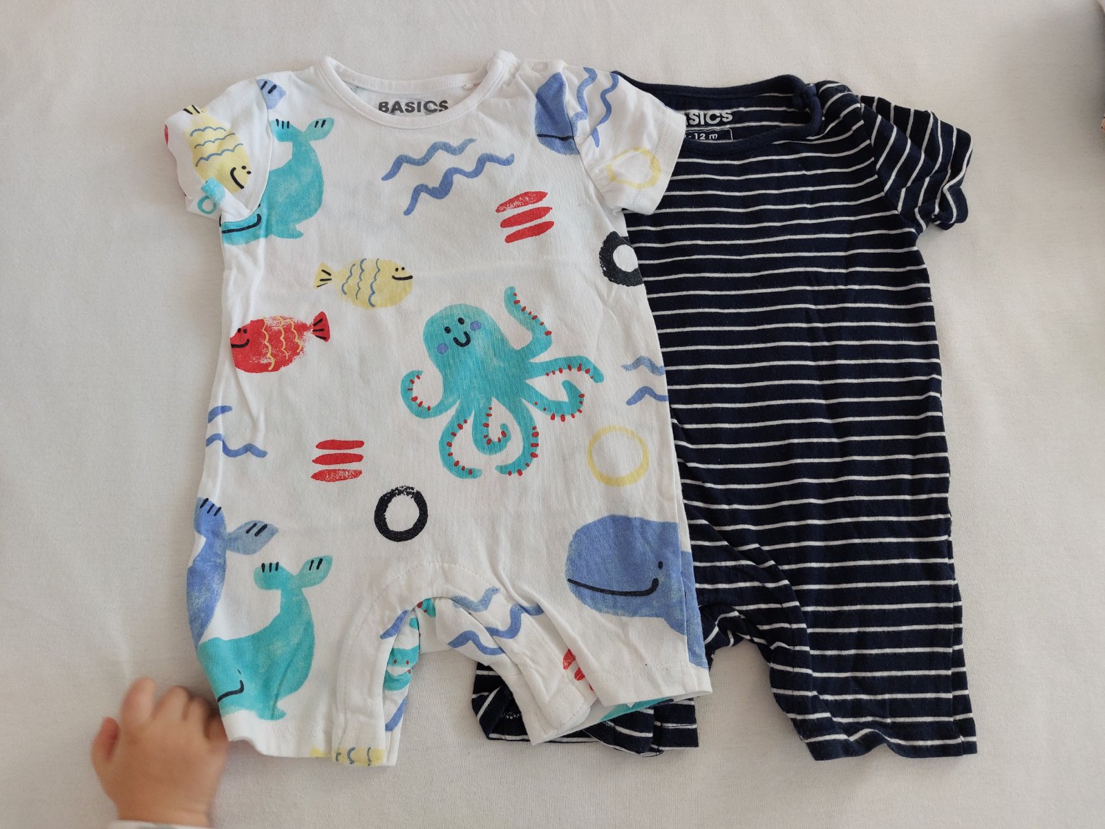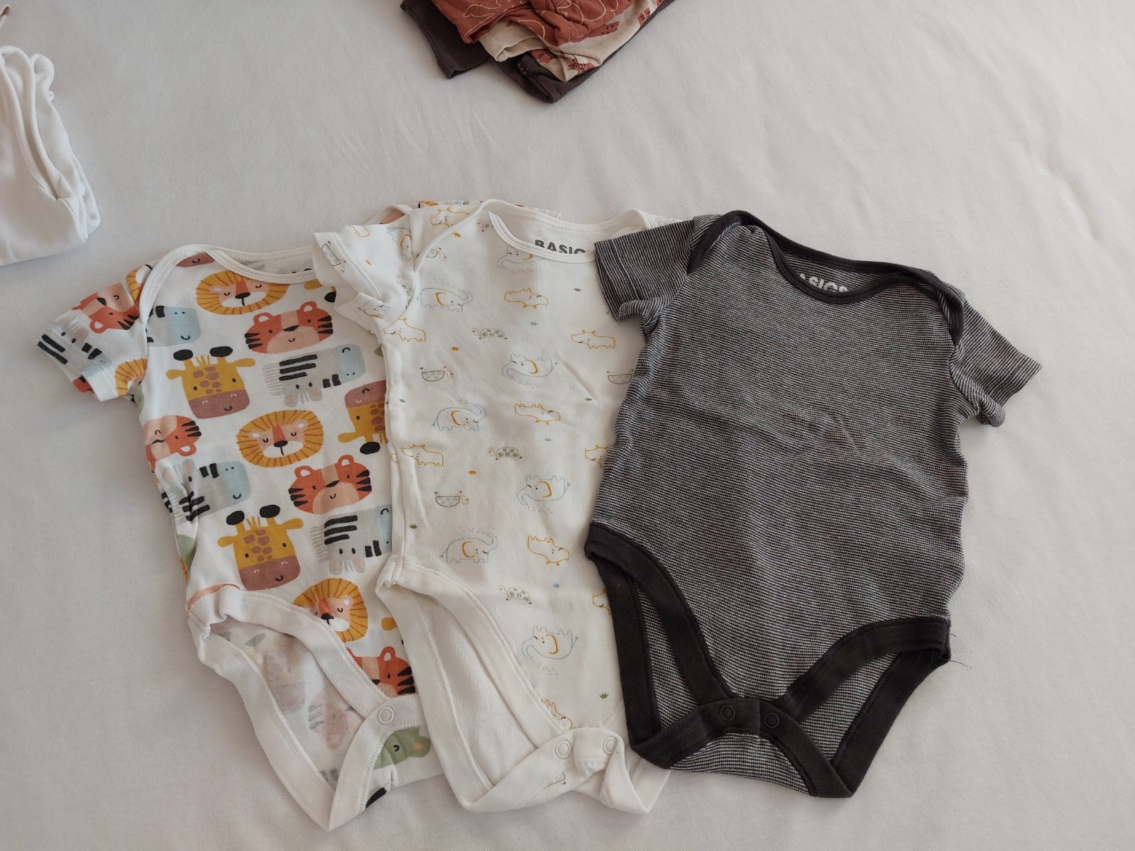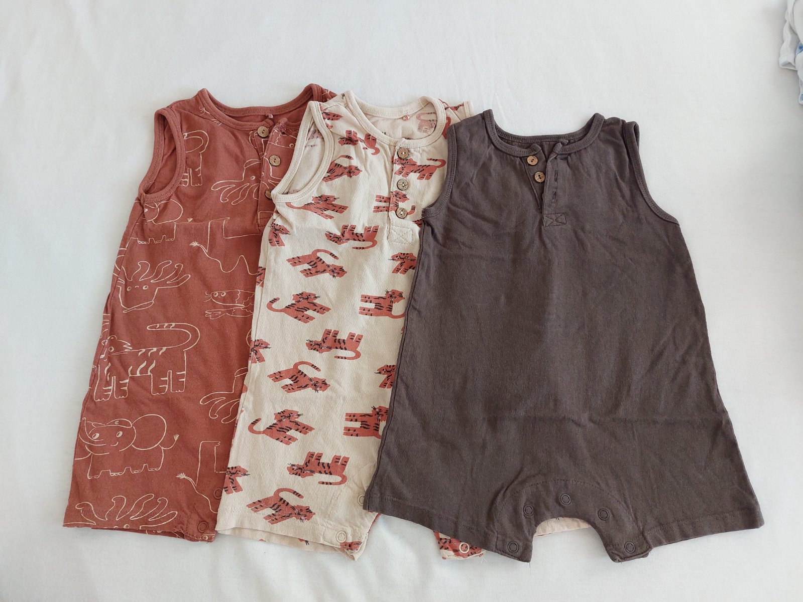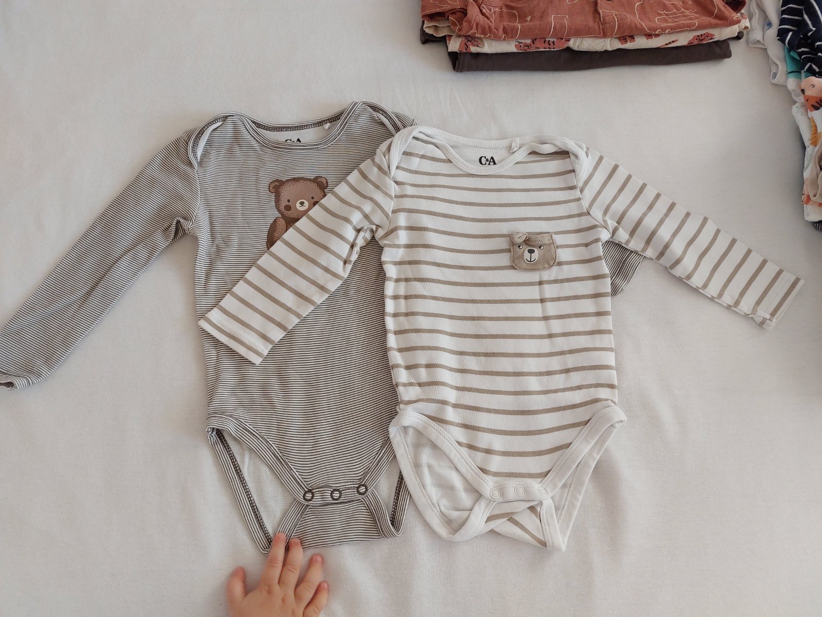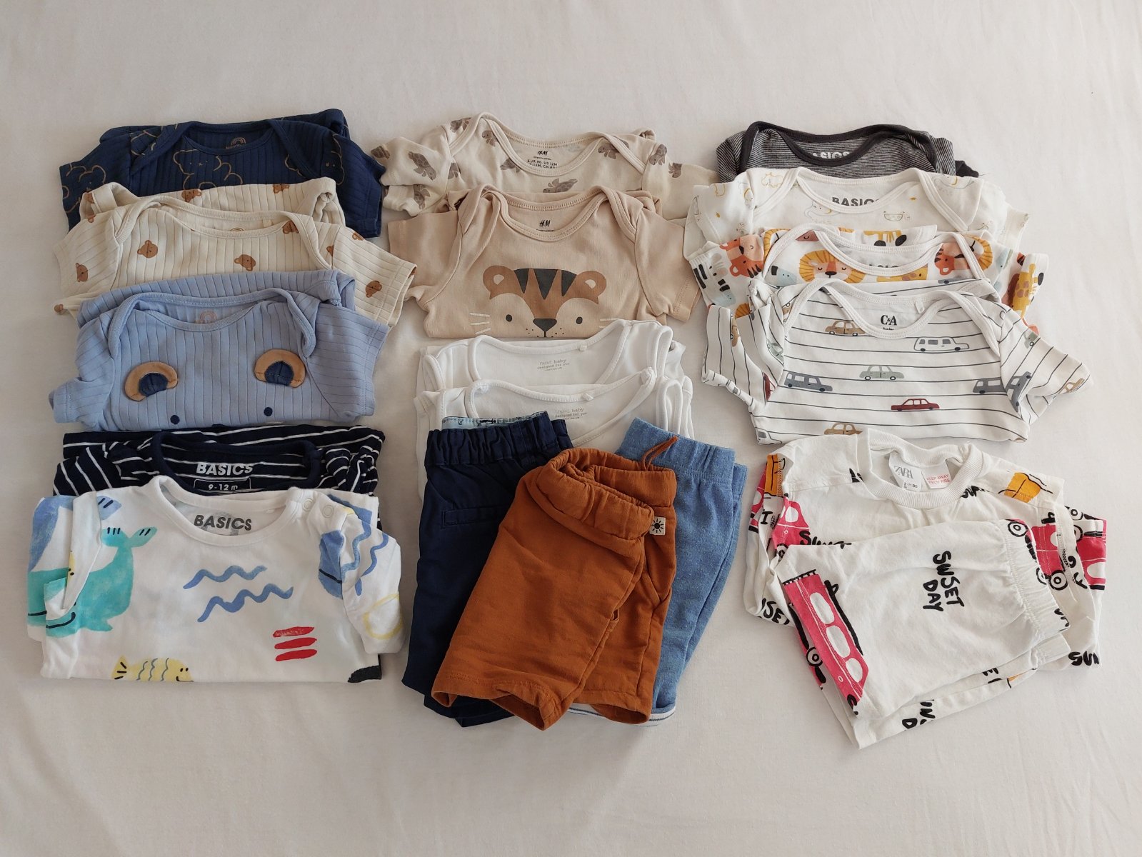 Značky ako H&M (body) , F&F (body, klobúky, 2 opalovacky), Next (bodyčka), C&A (bodyčka), Zara (súprava), Sinsay (tie 3 hnedé opalovačky).