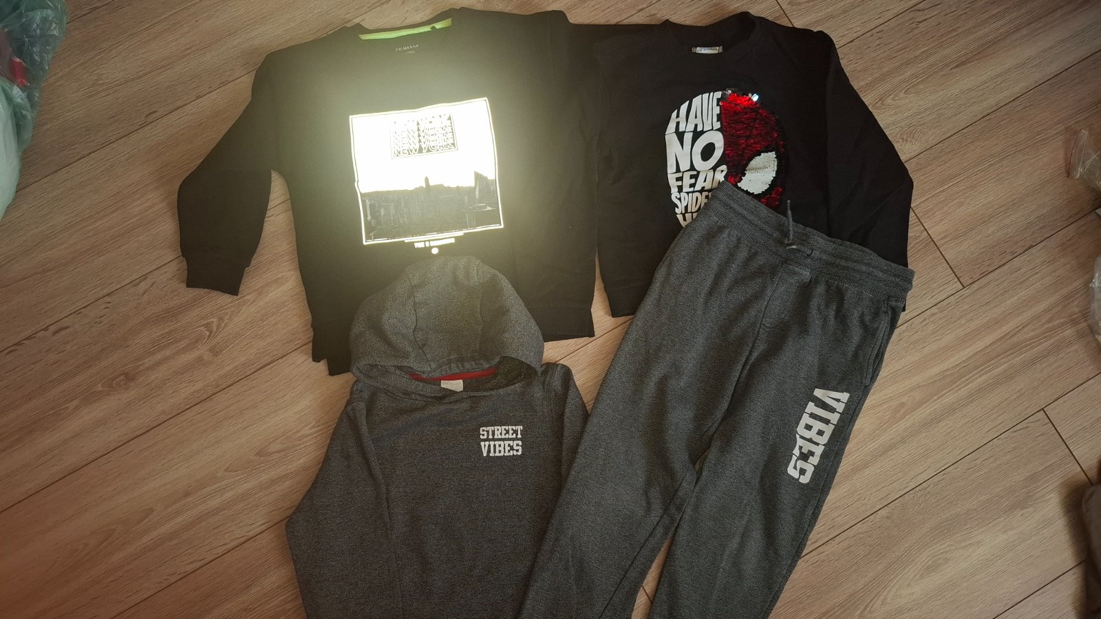 Tepláková súprava, mikiny, tričko, kraťasy -plavky, vsetko vo veľmi dobrom stave. Cena spolu 10