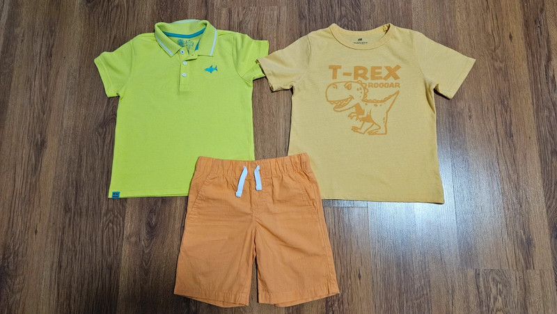 Zelené tričko zn. F&F, oranžové zn. H&M v.110/116, kraťasky zn. C&A.