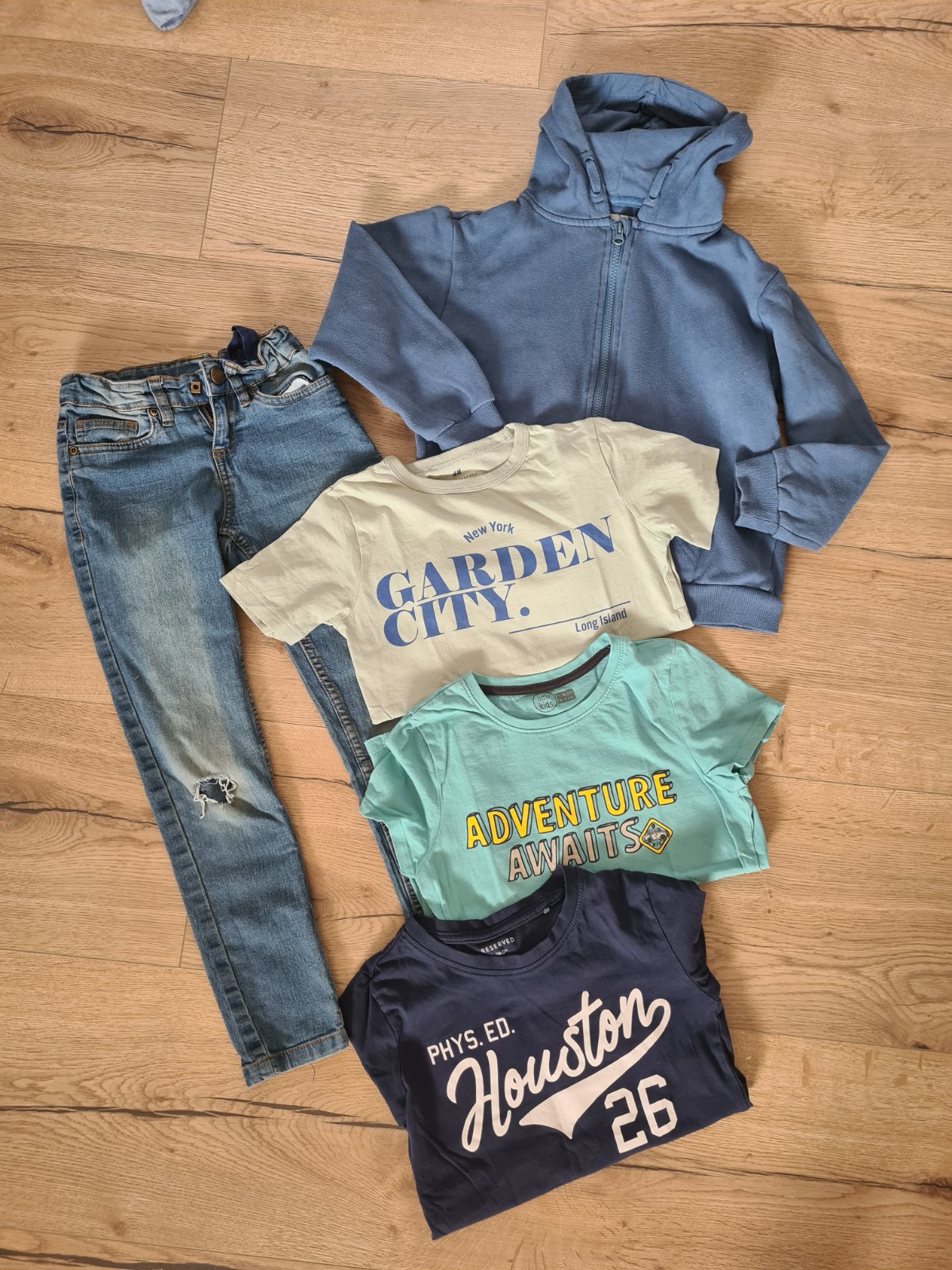 Chlapcensky balk velkost 128/ 134. Su v nom rifle, 2x kratke tricko, 1x tricko s dlhym, 1x mikina. Pozri si aj moje dalsie inzeraty, mozno ta nieco este zaujme.